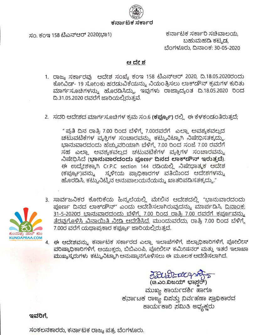 ಬೆಂಗಳೂರು: ಸಾರ್ವಜನಿಕರ ಕೋರಿಕೆಯ ಹಿನ್ನೆಲೆಯಲ್ಲಿ ಹಾಗೂ ರಾಜ್ಯದ ಜನತೆಯ ಹಿತದೃಷ್ಟಿಯಿಂದ ನಾಳೆಯ ಭಾನುವಾರ ( ಮೇ 31) ಸಂಪೂರ್ಣ ಲಾಕ್ ಡೌನ್ ಇರುವುದಿಲ್ಲ ಎಂದು ಮುಖ್ಯಮಂತ್ರಿ ಬಿಎಸ್ ಯಡಿಯೂರಪ್ಪ ಸ್ಪಷ್ಟಪಡಿಸಿದ್ದು, ಈ ಬಗ್ಗೆ ರಾಜ್ಯ ಸರಕಾರದ ಅಧಿಕೃತ ಆದೇಶವೂ ಹೊರಬಿದ್ದಿದೆ.
