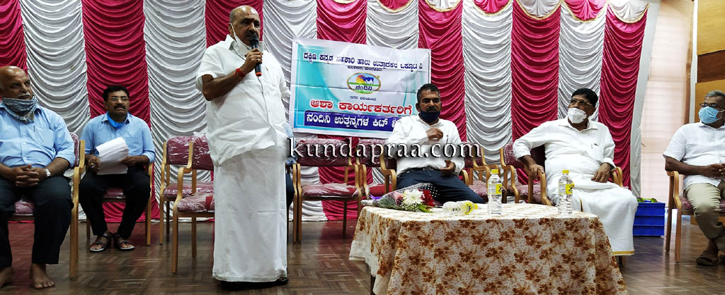 ಖಂಬದಕೋಣೆ ರೈತರ ಸೇವಾ ಸಹಕಾರಿ ಸಂಘದ ರೈತಸಿರಿ ಸಭಾಭವನದಲ್ಲಿ ಮಂಗಳವಾರ ತಾಲ್ಲೂಕಿನ ಆಶಾ ಕಾರ್ಯಕರ್ತರಿಗೆ ದಕ್ಷಿಣ ಕನ್ನಡ ಜಿಲ್ಲಾ ಹಾಲು ಉತ್ಪಾದಕರ ಒಕ್ಕೂಟದ ವತಿಯಂದ ನಂದಿನಿ ಉತ್ಪನ್ನಗಳ ಕಿಟ್ ವಿತರಿಸಿ ಮಾತನಾಡಿದರು.