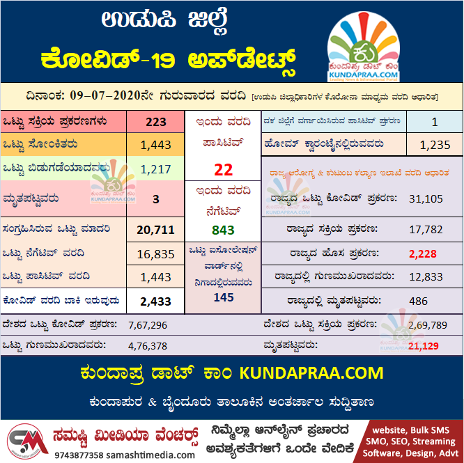ಈ ತನಕ ಒಟ್ಟು 20,711 ಮಾದರಿ ಸಂಗ್ರಹಿಸಿದ್ದು, ಅವುಗಳಲ್ಲಿ 16,835 ನೆಗೆಟಿವ್, 1,443 ಪಾಸಿಟಿವ್ ಬಂದಿದ್ದು, 2,433 ಮಂದಿಯ ವರದಿ ಬರುವುದು ಬಾಕಿ ಇದೆ. ಇಂದು ಬಂದಿರುವ ವರದಿಯಲ್ಲಿ 843 ನೆಗೆಟಿವ್, 22 ಪಾಸಿಟಿವ್ ಬಂದಿದೆ. ಒಟ್ಟು 1235 ಮಂದಿ ಹೋಮ್ ಕ್ವಾರಂಟೈನಿನಲ್ಲಿದ್ದಾರೆ.