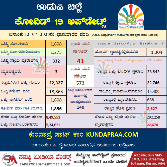 ಜಿಲ್ಲೆಯಲ್ಲಿ ಒಟ್ಟು 1,608 ಕೊರೋನಾ ಪಾಸಿಟಿವ್ ಪ್ರಕರಣಗಳು ದಾಖಲಾಗಿದ್ದು, ಆ ಪೈಕಿ 1,273 ಮಂದಿ ಬಿಡುಗಡೆಯಾಗಿದ್ದು, 332 ಮಂದಿ ಕೊರೋನಾ ಸೋಂಕಿತರಿಗೆ ಉಡುಪಿ, ಕುಂದಾಪುರ, ಕಾರ್ಕಳದ ಕೋವಿಡ್ ಆಸ್ಪತ್ರೆಯಲ್ಲಿ ಚಿಕಿತ್ಸೆ ನೀಡಲಾಗುತ್ತಿದೆ. ಈವರೆಗೆ ಮೂವರು ವ್ಯಕ್ತಿಗಳು ಮೃತಪಟ್ಟಿದ್ದಾರೆ.