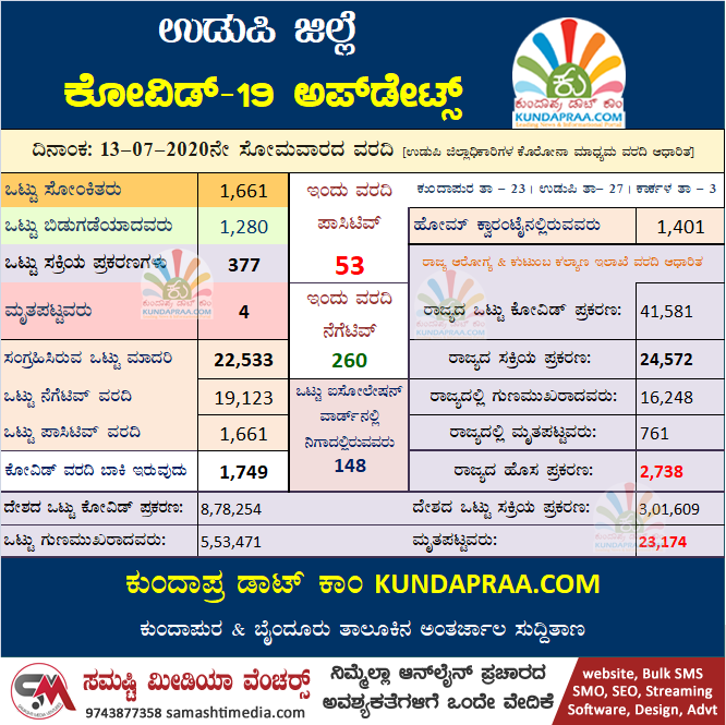 ಈ ತನಕ ಒಟ್ಟು 22,533 ಮಾದರಿ ಸಂಗ್ರಹಿಸಿದ್ದು, ಅವುಗಳಲ್ಲಿ 19,123 ನೆಗೆಟಿವ್, 1,661 ಪಾಸಿಟಿವ್ ಬಂದಿದ್ದು, 1,749 ಮಂದಿಯ ವರದಿ ಬರುವುದು ಬಾಕಿ ಇದೆ. ಇಂದು ಬಂದಿರುವ ವರದಿಯಲ್ಲಿ 260 ನೆಗೆಟಿವ್, 53 ಪಾಸಿಟಿವ್ ಬಂದಿದೆ. ಒಟ್ಟು 1,401 ಮಂದಿ ಹೋಮ್ ಕ್ವಾರಂಟೈನಿನಲ್ಲಿದ್ದಾರೆ.