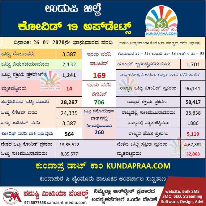 ಈ ತನಕ ಒಟ್ಟು 28,287 ಮಾದರಿ ಸಂಗ್ರಹಿಸಿದ್ದು, ಅವುಗಳಲ್ಲಿ 24,335 ನೆಗೆಟಿವ್, 3,388 ಪಾಸಿಟಿವ್ ಬಂದಿದ್ದು, 564 ಮಂದಿಯ ವರದಿ ಬರುವುದು ಬಾಕಿ ಇದೆ. ಇಂದು ಬಂದಿರುವ ವರದಿಯಲ್ಲಿ 493 ನೆಗೆಟಿವ್, 182 ಪಾಸಿಟಿವ್ ಬಂದಿದೆ. ಒಟ್ಟು 1,701 ಮಂದಿ ಹೋಮ್ ಕ್ವಾರಂಟೈನಿನಲ್ಲಿದ್ದಾರೆ.