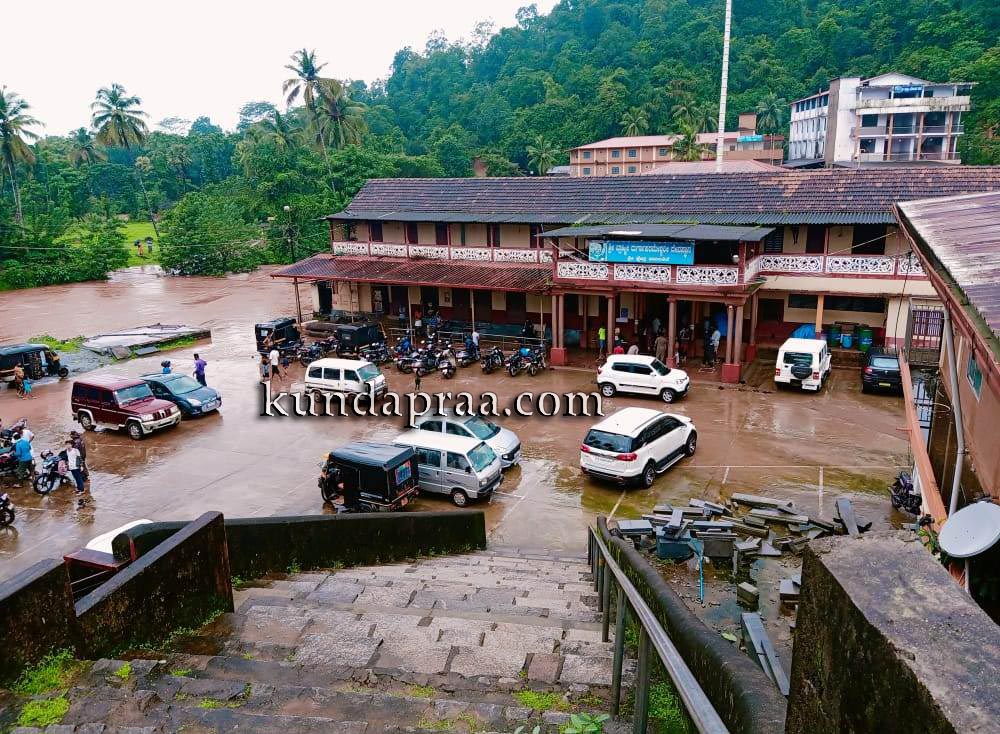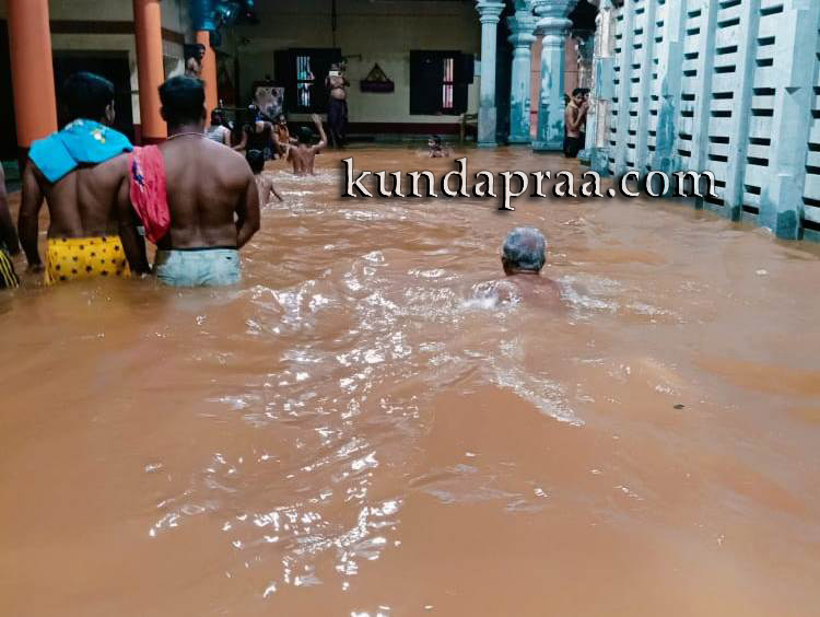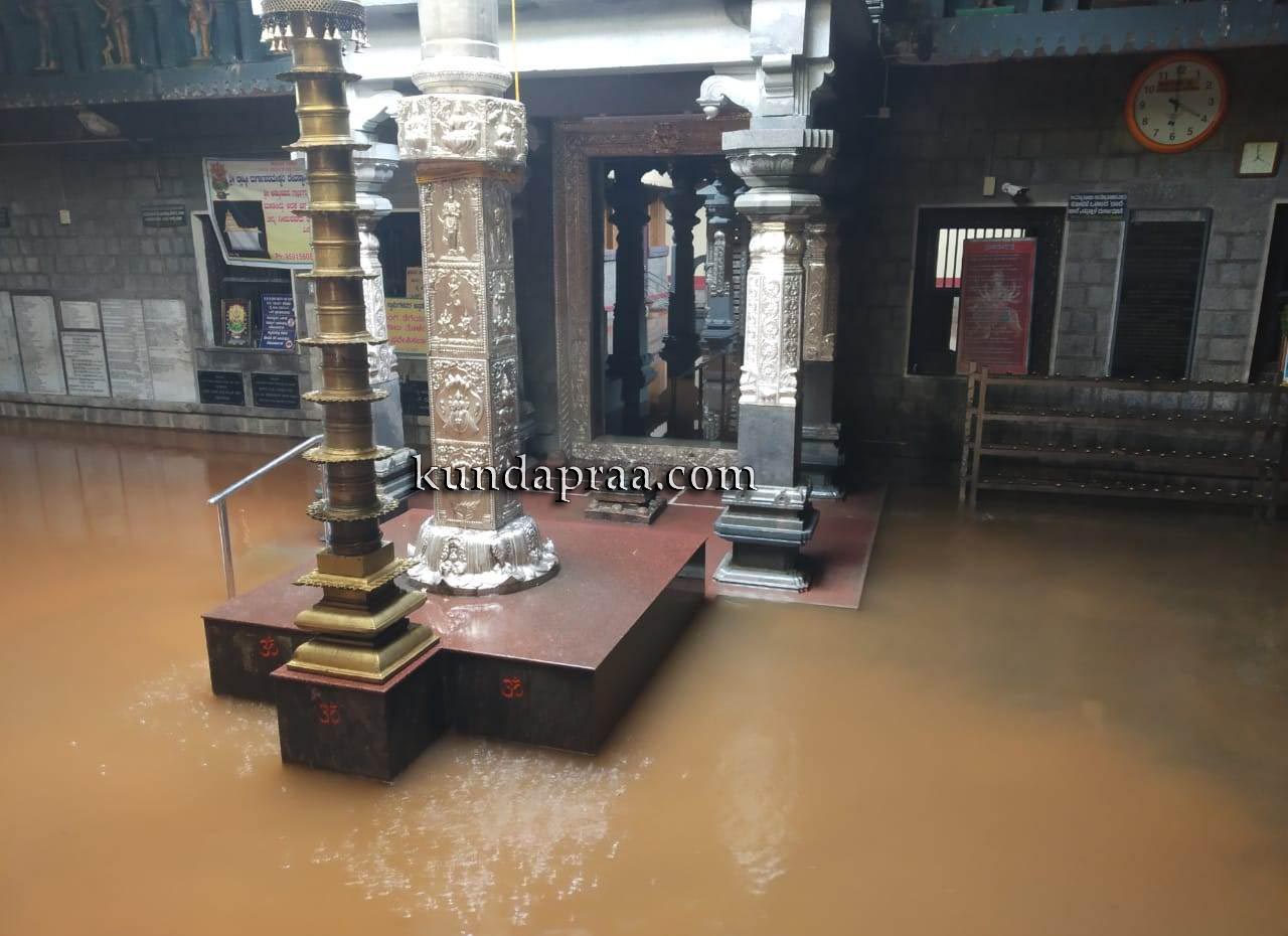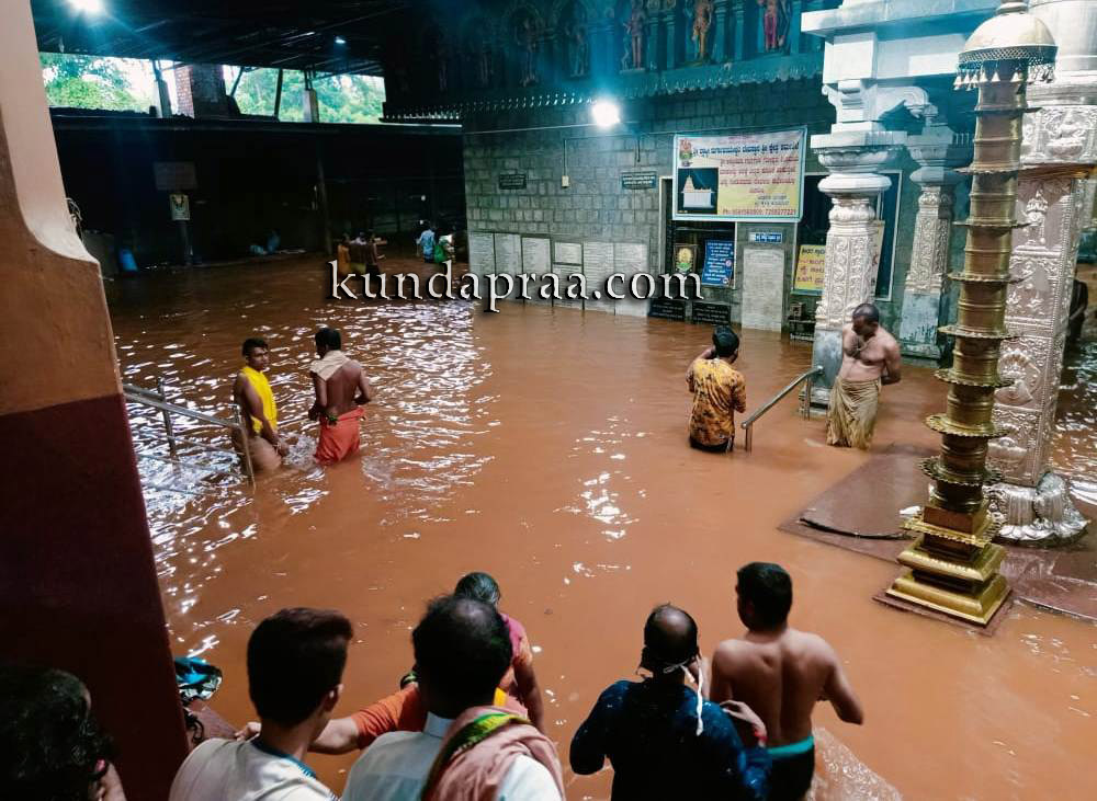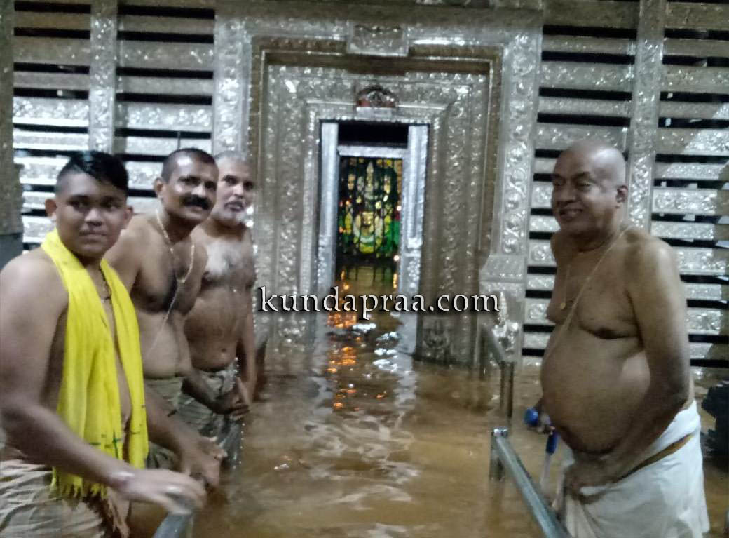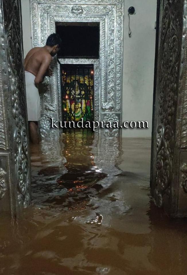ಕುಂದಾಪುರ: ಕಮಲಶಿಲೆ ಶ್ರೀ ಬ್ರಾಹ್ಮೀ ದುರ್ಗಾಪರಮೇಶ್ವರಿ ದೇವಸ್ಥಾನದ ಗರ್ಭಗುಡಿಯೊಳಕ್ಕೆ ಕುಬ್ಜಾ ನದಿ ನೀರು ನುಗ್ಗಿದ್ದು, ವಾಡಿಕೆಯಂತೆ ದೇವಿಯ ಪಾದ ತೊಳೆದಿದೆ. ಈ ಸಂದರ್ಭ ಸುತ್ತಲೂ ಜಲಾವೃತವಾಗಿ ನೀರಿನ ಮಧ್ಯೆ ಕುಳಿತಿರುವ ದೇವಿಯನ್ನು ಕಂಡು ಭಕ್ತರು ಪುನೀತರಾದರು.