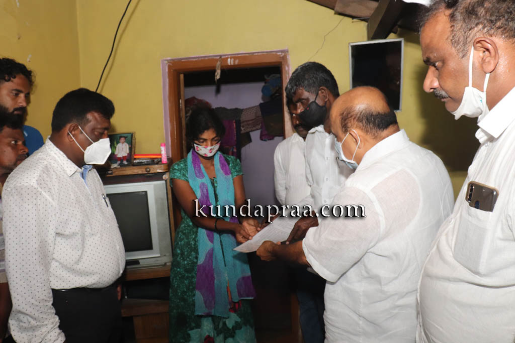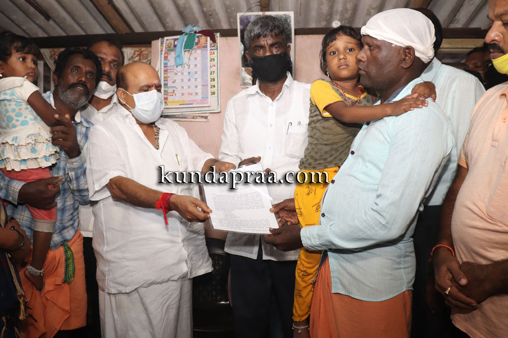 ಬೈಂದೂರು: ಕೊಡೇರಿಯಲ್ಲಿ ನಡೆದ ದೋಣಿ ದುರಂತದಲ್ಲಿ ಮೃತರಾದ ನಾಲ್ವರು ಮೀನುಗಾರರ ಮನೆಗಳಿಗೆ ಶುಕ್ರವಾರ ಬಂದರು ಮತ್ತು ಮೀನುಗಾರಿಕಾ ಸಚಿವ ಕೋಟ ಶ್ರೀನಿವಾಸ ಪೂಜಾರಿ ಹಾಗೂ ಶಾಸಕ ಬಿ. ಎಂ. ಸುಕುಮಾರ ಶೆಟ್ಟಿ ಭೇಟಿ ನೀಡಿ ರೂ. 6 ಲಕ್ಷ ಮೊತ್ತದ ತುರ್ತು ಪರಿಹಾರದ ಆದೇಶ ಪ್ರತಿಯನ್ನು ಕುಟುಂಬಿಕರಿಗೆ ಹಸ್ತಾಂತರಿಸಿದರು.