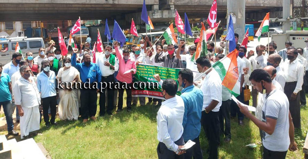 ಮಾಜಿ ಶಾಸಕ ಕೆ. ಗೋಪಾಲ ಪೂಜಾರಿ ಮಾತನಾಡಿ ಭೂಸುಧಾರಣಾ ಕಾಯಿದೆ, ಎಪಿಎಂಸಿ ಕಾಯಿದೆ, ಅಗತ್ಯ ವಸ್ತುಗಳ ಕಾಯಿದೆ ಮತ್ತು ಕಾರ್ಮಿಕ ಕಾಯಿದೆಗಳ ತಿದ್ದುಪಡಿಗೆ ಮುಂದಾಗಿರುವ ಕೇಂದ್ರ ಮತ್ತು ರಾಜ್ಯ ಬಿಜೆಪಿ ಸರ್ಕಾರದ ಹೆಜ್ಜೆ ರೈತ, ಕಾರ್ಮಿಕ ವಿರೋಧಿಯೂ, ಕಾರ್ಪೊರೇಟ್ ವಲಯದ ಪರವೂ ಆಗಿದೆ ಎಂದು ಆರೋಪಿಸಿದರು.
