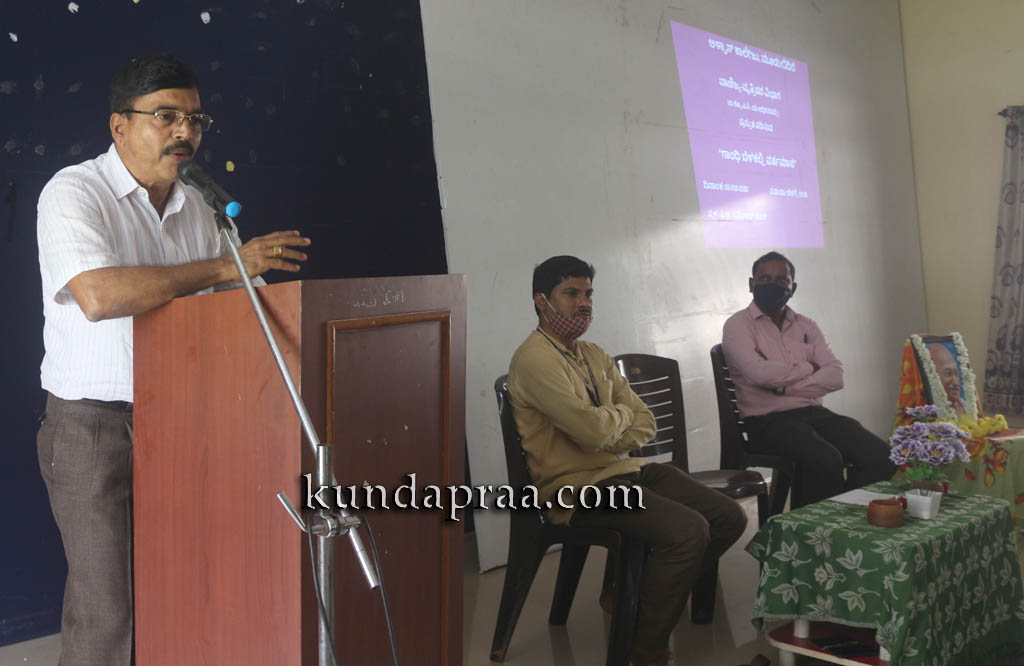 ಕಾರ್ಯಕ್ರಮ ಉದ್ಘಾಟಿಸಿ ಮಾತನಾಡಿದ, ಆಳ್ವಾಸ್ ಪದವಿ ಕಾಲೇಜಿನ ಕನ್ನಡ ವಿಭಾಗದ ಮುಖ್ಯಸ್ಥ ಡಾ. ಯೋಗೀಶ್ ಕೈರೋಡಿ ’ಗಾಂಧಿ ಹೇಳಿರುವ ಹಾಗೆ ಆರ್ಥಿಕ ಸ್ವಾವಲಂಬನೆಯ ಜೊತೆಗೆ ಮಾನಸಿಕ ಸ್ವಾವಲಂಬನೆ ಕೂಡ ಆಗಬೇಕು. ಪ್ರಾಯೋಗಿಕವಾಗಿ ಸರಳ ಜೀವನ ನಡೆಸುವ ಬಗ್ಗೆ ಚಿಂತನೆಯಾಗಬೇಕು’ ಗಾಂಧಿಯವರು ಬದುಕಿನಲ್ಲಿ ಅಳವಡಿಸಿದ್ದ ಸರಳತೆ, ಸಂದೇಶವನ್ನು ನಮ್ಮ ಬದುಕಿನಲ್ಲಿ ಅಳವಡಿಸಿಕೊಳ್ಳುತ್ತಾ, ಮಹಾತ್ಮನನ್ನು ಮತ್ತೊಂದು ತಲೆಮಾರಿಗೆ ತಲುಪಿಸುವ ಪ್ರಯತ್ನವಾಗಬೇಕು. ಎಂದು ಹೇಳಿದರು.