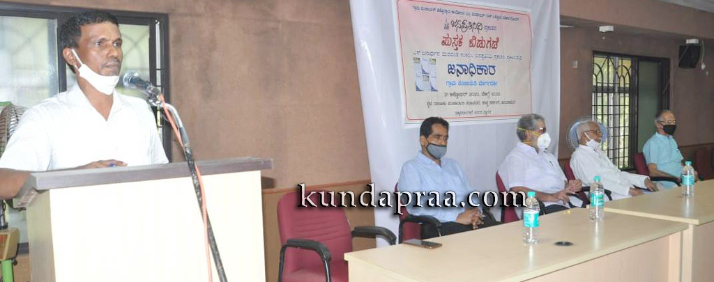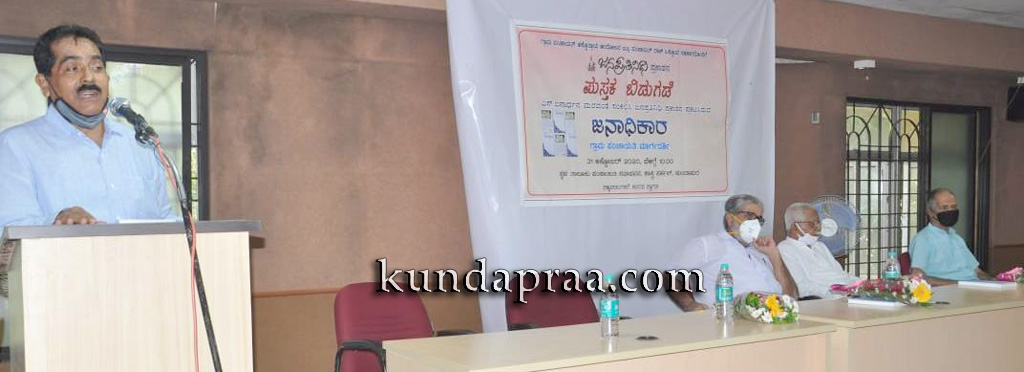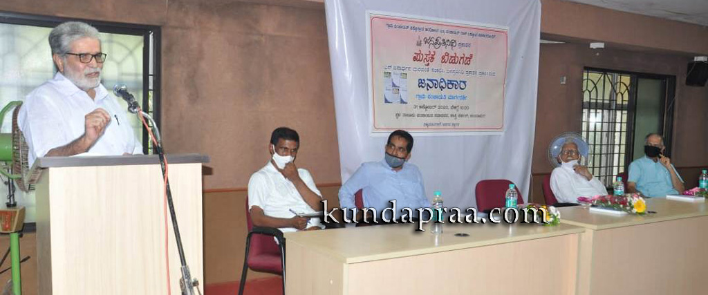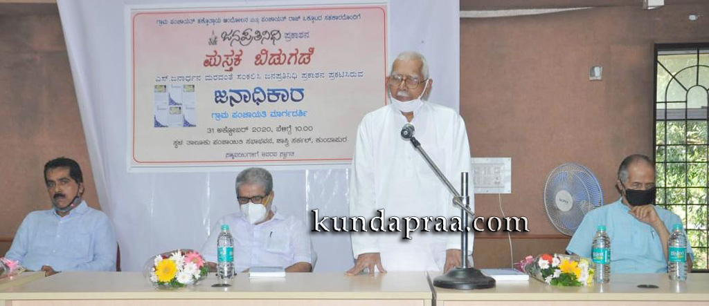 ಗ್ರಾಮ ಪಂಚಾಯತ್ ಹಕ್ಕೋತ್ತಾಯ ಆಂದೋಲನ ಮತ್ತು ಪಂಚಾಯತ್ ರಾಜ್ ಒಕ್ಕೂಟ ಇವರ ಸಹಕಾರದೊಂದಿಗೆ ಕುಂದಾಪುರ ತಾಲೂಕು ಪಂಚಾಯತಿ ಸಭಾಭವನದಲ್ಲಿ ನಡೆದ ಜನಪ್ರತಿನಿಧಿ ಪ್ರಕಾಶನ ಕುಂದಾಪುರ ಪ್ರಕಟಿಸಿರುವ ಪಂಚಾಯತ್ ರಾಜ್ ತಜ್ಞ ಎಸ್.ಜನಾರ್ದನ ಮರವಂತೆ ಸಂಕಲಿಸಿರುವ ಜನಾಧಿಕಾರ ಗ್ರಾಮ ಪಂಚಾಯಿತಿ ಮಾರ್ಗದರ್ಶಿ ಪುಸ್ತಕ ಬಿಡುಗಡೆ ಕಾರ್ಯಕ್ರಮದ ಅಧ್ಯಕ್ಷತೆ ವಹಿಸಿ ಮಾತನಾಡಿದರು.