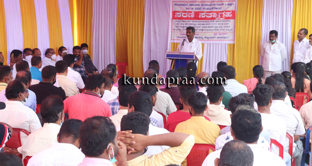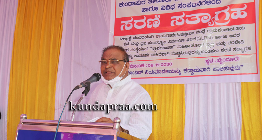 ಕುಂದಾಪುರ ತಾಲ್ಲೂಕು ಪಂಚಾಯತ್ ರಾಜ್ ಒಕ್ಕೂಟ ಮತ್ತು ವಿವಿಧ ಸಂಘಟನೆಗಳ ಆಶ್ರಯದಲ್ಲಿ ಬೈಂದೂರಿನಲ್ಲಿ ಶುಕ್ರವಾರ ನಡೆದ ಧರಣಿಯಲ್ಲಿ ಅವರು ಮಾತನಾಡಿದರು. ವಂಡ್ಸೆ ಮಹಿಳಾ ಸ್ವಾವಲಂಬನಾ ಹೊಲಿಗೆ ವೃತ್ತಿ ಮತ್ತು ತರಬೇತಿ ಕೇಂದ್ರವನ್ನು ಕಾನೂನಿನ ಹದ್ದುಮೀರಿ ತೆರವುಗೊಳಿಸಿರುವುದರ ವಿರುದ್ಧದ ಹೋರಾಟದಲ್ಲಿ ನ್ಯಾಯಾಂಗದಿಂದ ಭಾಗಶ: ನ್ಯಾಯ ಸಿಕ್ಕಿದ ಕಾರಣ ಸರಣಿ ಧರಣಿ ಸತ್ಯಾಗ್ರಹ ಅಂತ್ಯಗೊಳ್ಳಲಿದೆ. ಆದರೆ ಸಂಪೂರ್ಣ ನ್ಯಾಯ ಸಿಗುವ ವರೆಗೆ ಹೋರಾಟ ಮುಂದುವರಿಯಲಿದ್ದು ಅಗತ್ಯವೆನಿಸಿದರೆ ಜಿಲ್ಲಾ ಪಂಚಾಯಿತಿಗೆ ಮುತ್ತಿಗೆ ಹಾಕಲಾಗುವುದು ಎಂದು ಅವರು ಹೇಳಿದರು.