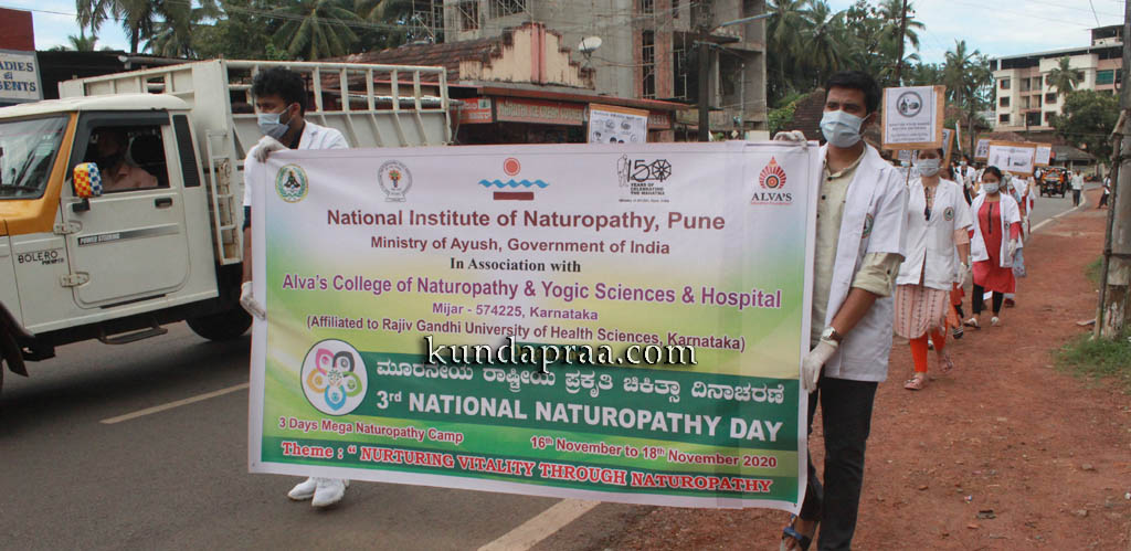 ಮೂಡಬಿದರೆ: ಆಳ್ವಾಸ್ ನ್ಯಾಚರೋಪತಿ ಮತ್ತು ಯೋಗ ವಿಜ್ಞಾನ ಕಾಲೇಜು, ಹಾಗು ರಾಷ್ಟ್ರೀಯ ಪ್ರಕೃತಿ ಚಿಕಿತ್ಸಾ ಸಂಸ್ಥೆ ಪುಣೆ ಇವರ ಜಂಟಿ ಆಶ್ರಯದಲ್ಲಿ ರಾಷ್ಟ್ರೀಯ ಪ್ರಕೃತಿ ಚಿಕಿತ್ಸಾ ದಿನಾಚರಣೆ – 2020 ಆಚರಿಸಲಾಯಿತು. ಕಾರ್ಯಾಕ್ರಮದ ಅಂಗವಾಗಿ ಕೋವಿಡ್-19 ಸಂದರ್ಭದಲ್ಲಿ ಜನತೆ ತೆಗೆದುಕೊಳ್ಳಬೇಕಾದ ಮುಂಜಾಗೃತ ಕ್ರಮಗಳ ಬಗ್ಗೆ ಅರಿವು ಮೂಡಿಸಲು ಜನಾಂದೋಲನ ಜಾಗೃತಿ ಕಾಲ್ನಡಿಗೆ ಜಾಥ, ಮೂಡುಬಿದಿರೆಯ ನವಮಿ ವೃತ್ತದಿಂದ ನಗರ ಪೋಲಿಸ್ ಠಾಣೆಯವರೆಗೆ ಹಮ್ಮಿಕೊಳ್ಳಲಾಯಿತು.