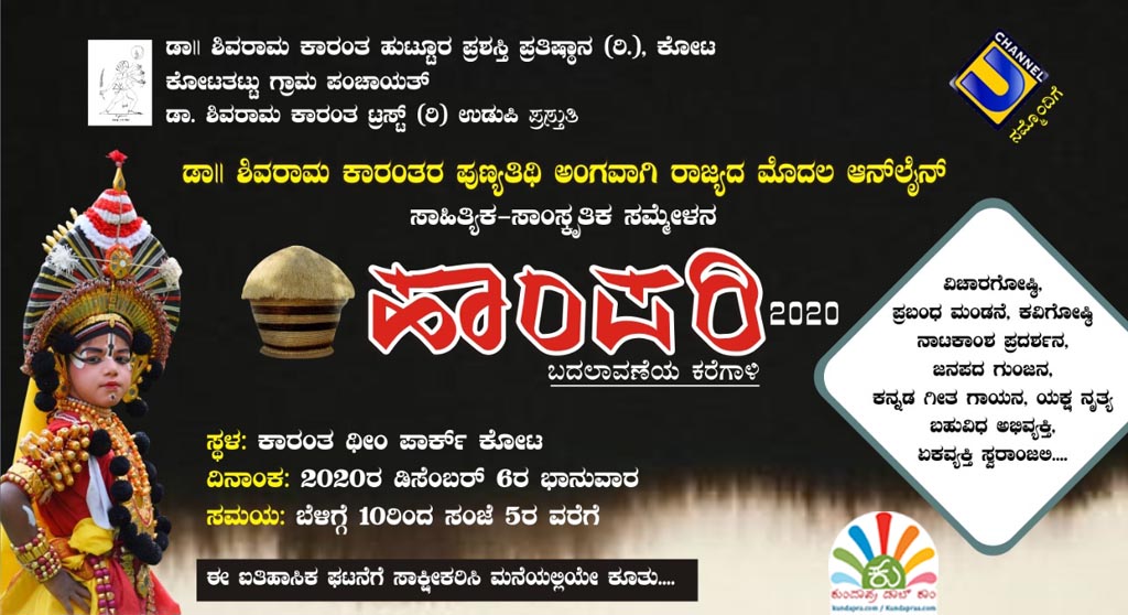 ಕೋಟ: ಡಾ. ಶಿವರಾಮ ಕಾರಂತ ಪ್ರತಿಷ್ಠಾನ ಕೋಟ, ಕೋಟತಟ್ಟು ಗ್ರಾಮ ಪಂಚಾಯತ್, ಡಾ. ಶಿವರಾಮ ಕಾರಂತ ಟ್ರಸ್ಟ್ ಉಡುಪಿ ಇವರ ಸಹಯೋಗದಲ್ಲಿ ಡಾ. ಶಿವರಾಮ ಕಾರಂತರ ಪುಣ್ಯತಿಥಿ ಅಂಗವಾಗಿ ರಾಜ್ಯದ ಮೊದಲ ಆನ್ ಲೈನ್ ಸಾಹಿತ್ಯಿಕ – ಸಾಂಸ್ಕೃತಿಕ ಸಮ್ಮೇಳನ ಹಾಂಪರಿ – 2020 (ಬದಲಾವಣೆಯ ಕರೆಗಾಳಿ ) ಕೋಟದ ಕಾರಂತ ಥೀಮ್ ಪಾರ್ಕ್ನಲ್ಲಿ ಡಿಸೆಂಬರ್ 6 ರ ಭಾನುವಾರ ಬೆಳಿಗ್ಗೆ 10 ರಿಂದ ಸಂಜೆ 5ರ ತನಕ ನಡೆಯಲಿದೆ.