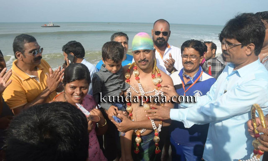 ಕುಂದಾಪುರ: ಕಾಲಿಗೆ ಸರಪಳಿ ಕಟ್ಟಿಕೊಂಡು ಪದ್ಮಾಸನ ಭಂಗಿಯಲ್ಲಿ ಸಮುದ್ರದಲ್ಲಿ ಯಶಸ್ವಿಯಾಗಿ ಒಂದು ಕಿ.ಮೀ. ಈಜಿರುವ ಗುಜ್ಜಾಡಿ ಗ್ರಾಮದ ಕಂಚುಗೋಡಿನ ಶಿಕ್ಷಕ ನಾಗರಾಜ ಖಾರ್ವಿ ಅವರು ಇಂಡಿಯಾ ಬುಕ್ ಆಫ್ ರೆಕಾರ್ಡ್ನಲ್ಲಿ ದಾಖಲೆ ಬರೆದಿದ್ದಾರೆ.