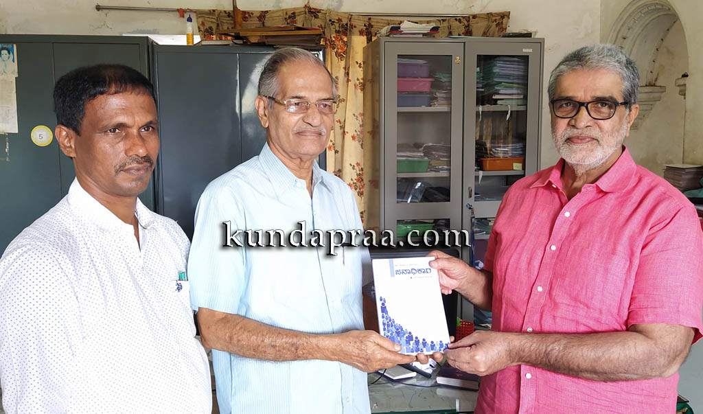 ಬೈಂದೂರು: ಸುಬ್ರಹ್ಮಣ್ಯ ಪಡುಕೋಣೆ ಮತ್ತು ಎಸ್. ಜನಾರ್ದನ ಮರವಂತೆ ಇವರು ‘ಜನಾಧಿಕಾರ’ ಪುಸ್ತಕವನ್ನು ಕೆ. ಪ್ರತಾಪಚಂದ್ರ ಶೆಟ್ಟಿ ಅವರಿಗೆ ಹಸ್ತಾಂತರಿಸಲಾಯಿತು.