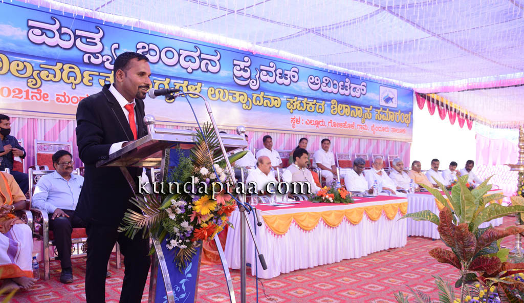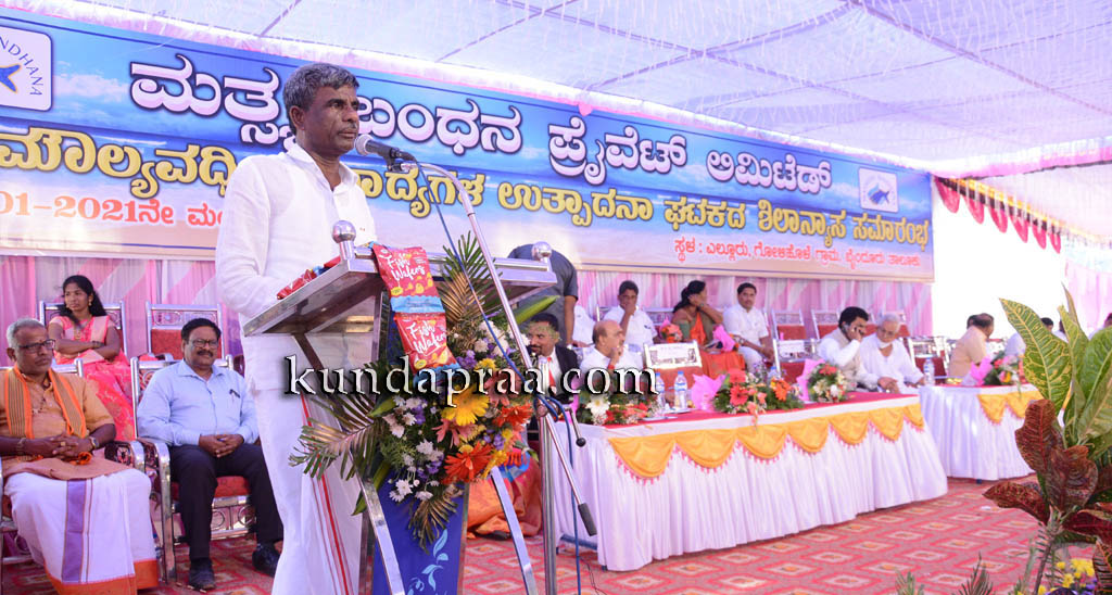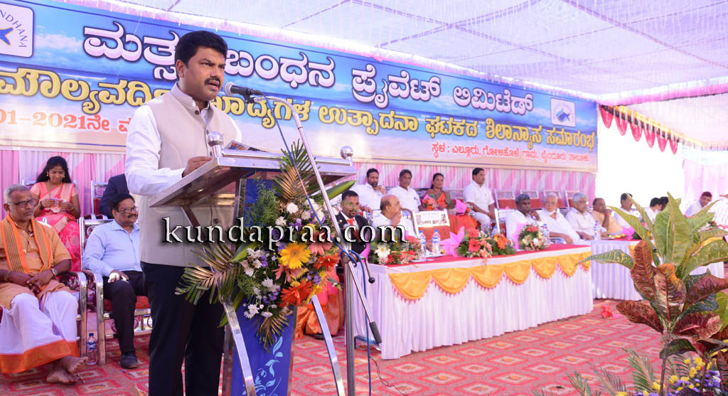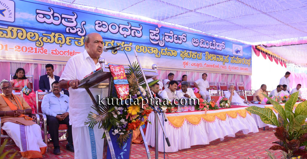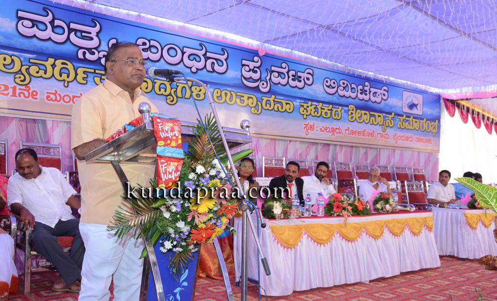 ಅವರು ಬೈಂದೂರು ತಾಲೂಕು ಗೋಳಿಹೊಳೆ ಗ್ರಾಮದ ಎಲ್ಲೂರಿನಲ್ಲಿ ಮತ್ಸ್ಯ ಬಂಧನ ಪ್ರೈವೆಟ್ ಲಿಮಿಟೆಡ್ ವತಿಯಿಂದ ನಿರ್ಮಾಣವಾಗುವ ಮೀನಿನ ಮೌಲ್ಯವರ್ಧಿತ ಖಾದ್ಯಗಳ ಉತ್ಪಾದನಾ ಘಟಕಕ್ಕೆ ಶಿಲಾನ್ಯಾಸ ನೆರವೇರಿಸಿ ಮಾತನಾಡಿ ಮತ್ಸ್ಯಬಂಧನ ಮೀನಿನ ಮೌಲ್ಯವರ್ಧಿತ ಖಾದ್ಯಗಳನ್ನು ರಾಜ್ಯದ ಮುಖ್ಯಮಂತ್ರಿಗಳು ಜೂನ್ನಲ್ಲಿಯೇ ಬಿಡುಗಡೆಗೊಳಿಸಿದ್ದಾರೆ. ಮೀನಿನ ಖಾದ್ಯಗಳ ಮಾರುಕಟ್ಟೆ ವ್ಯವಸ್ಥೆಗೆ ರೈಲ್ವೆ ನಿಲ್ದಾಣಗಳಲ್ಲಿ ಅಳವಡಿಸಿಕೊಂಡರೆ ಲಕ್ಷಾಂತರ ಜನರಿಗೆ ಉದ್ಯೋಗ ಸೃಷ್ಟಿಯಾಗುತ್ತದೆ. ಈ ಬಗ್ಗೆ ಪ್ರಯತ್ನ ನಡೆಯುತ್ತಿದೆ ಎಂದರು.
