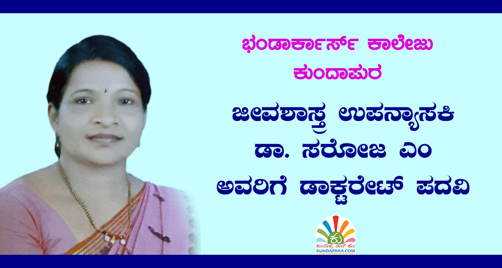ಕುಂದಾಪುರ: ಇಲ್ಲಿನ ಭಂಡಾರ್ಕಾರ್ಸ್ ಪದವಿ ಪೂರ್ವಕಾಲೇಜಿನ ಜೀವಶಾಸ್ತ್ರ ವಿಬಾಗದ ಉಪನ್ಯಾಸಕಿಯಾಗಿ ಸೇವೆ ಸಲ್ಲಿಸುತ್ತಿರುವ ಡಾ. ಸರೋಜ ಎಂ ಅವರಿಗೆ ಮೈಸೂರು ವಿಶ್ವವಿದ್ಯಾನಿಲಯದಿಂದ ಡಾಕ್ಟರೇಟ್ ಪದವಿ ಪಡೆದಿದ್ದಾರೆ.