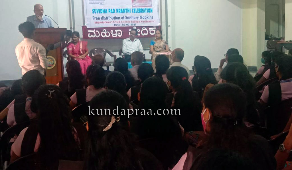 ಕುಂದಾಪುರ: ಇಲ್ಲಿನ ಭಂಡಾರ್ಕಾರ್ಸ್ ಕಾಲೇಜಿನ ಮಹಿಳಾ ವೇದಿಕೆ ಮತು ಕುಂದಾಪುರದ ಪ್ರದಾನಮಂತ್ರಿ ಜನೌಷಧಿ ಕೇಂದ್ರ ಕುಂದಾಪುರ ರೆಡ್ಕ್ರಾಸ್ಘಟಕದ ಸಹಯೋಗದಲ್ಲಿಸುವಿಧಾ ಪ್ಯಾಡ್ಕ್ರಾಂತಿ ಆಚರಣೆ ಪ್ರಯುಕ್ತ ಉಚಿನ ಸ್ಯಾನಿಟರಿ ಪ್ಯಾಡ್ ವಿತರಣೆ ಕಾರ್ಯಕ್ರಮ ನಡೆಯಿತು.