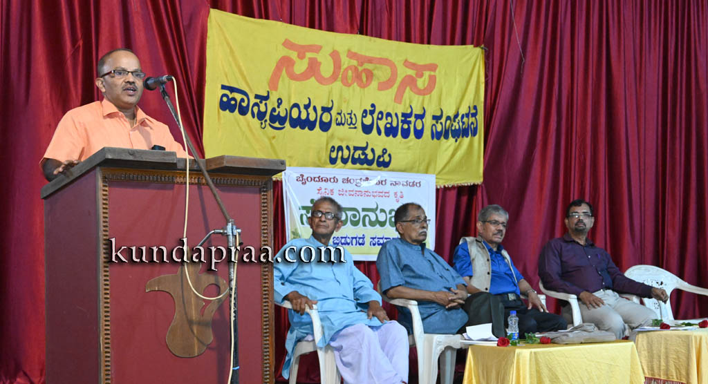 ಅವರು ಶನಿವಾರ ಉಡುಪಿ ಸುಹಾಸಂ ನೇತೃತ್ವದಲ್ಲಿ ಹೊಟೆಲ್ ಕಿದಿಯೂರಿನ ರೂಪ್ ಟಾಪ್ ಹಾಲಿನಲ್ಲಿ ಆಯೋಜನೆಗೊಂಡ ಸಮಾರಂಭದಲ್ಲಿ ಬೈಂದೂರು ಚಂದ್ರಶೇಖರ ನಾವಡರ ಸೇನಾನುಭವ ಕೃತಿ ಬಿಡುಗಡೆಗೊಳಿಸಿ ಮಾತನಾಡಿ ಈ ಕೃತಿಯು ಸೇನಾನುಭವ, ಸೇವಾನುಭವ ಮತ್ತು ಸೇವಾನುಭಾವದ ಮೂರು ಆಯಾಮವನ್ನು ಒಳಗೊಂಡಿದ್ದು, ಪರಿಪೂರ್ಣತೆಯೆಡೆಗೆ ಸಾಗಿದೆ. ಚಂದ್ರಶೇಖರ ನಾವುಡರಲ್ಲಿ ಪತ್ರಕರ್ತನಲ್ಲಿರಬೇಕಾದ ನಿರೂಪಣಾ ಶೈಲಿ, ಸಾಹಿತ್ಯಿಕ ಪಟುತ್ವ ಕರಗತವಾಗಿರುವುದರಿಂದ ತಮ್ಮ ಕೃತಿಯಲ್ಲಿ ಹಲವು ವಿಚಾರಗಳನ್ನು ಸೊಗಸಾಗಿ ವಿವರಿಸಿದ್ದಾರೆ ಎಂದರು.