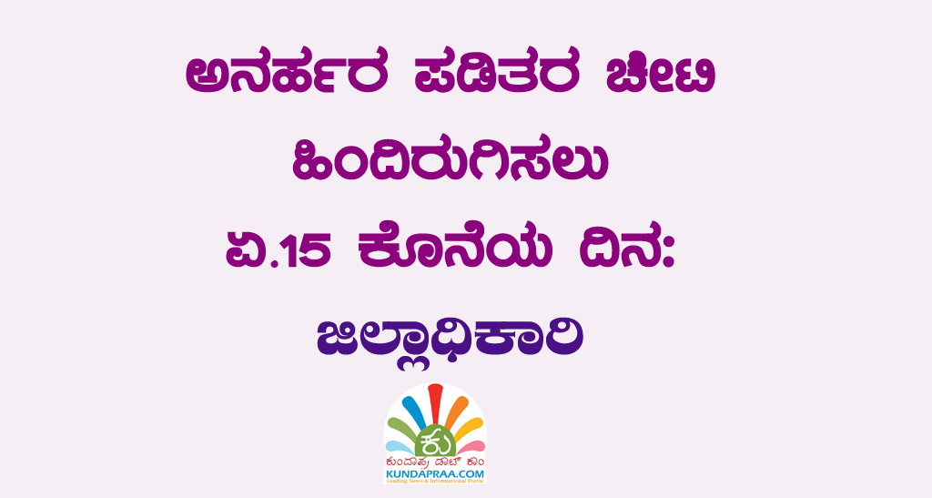 ಉಡುಪಿ: ಅನ್ನಭಾಗ್ಯ ಯೋಜನೆಯಡಿ ದುರ್ಬಲ ಕುಟುಂಬಗಳಿಗೆ ನೀಡುವ ಅಂತ್ಯೋದಯ ಮತ್ತು ಆದ್ಯತಾ (ಬಿಪಿಎಲ್) ಕಾರ್ಡನ್ನು ಆರ್ಥಿಕವಾಗಿ ಸಧೃಡವಾದ ಕೆಲವು ಕುಟುಂಬಗಳು ಆದ್ಯತಾ (ಬಿಪಿಎಲ್) ಕಾರ್ಡ್ ಪಡೆಯುವ ಬಗ್ಗೆ ಮಾನದಂಡವನ್ನು ಉಲ್ಲಂಘಿಸಿ, ಸುಳ್ಳು ಮಾಹಿತಿ ನೀಡಿ, ಅಂತ್ಯೋದಯ ಮತ್ತು ಆದ್ಯತಾ (ಬಿಪಿಎಲ್) ಕಾರ್ಡ್ ಪಡೆದುಕೊಂಡಿರುವುದು ಕಂಡುಬಂದಿದ್ದು, ಅಂತಹ ಅನರ್ಹರು ಪಡೆದಿರುವ ಕಾರ್ಡನ್ನು ಪತ್ತೆಹಚ್ಚಿ ಆದ್ಯತೇತರ ಪಡಿತರ ಚೀಟಿಯನ್ನಾಗಿ ಪರಿವರ್ತಿಸುವ ಬಗ್ಗೆ ಸರ್ಕಾರ ಗಂಭೀರವಾಗಿ ಪರಿಗಣಿಸಿದ್ದು, ಆರ್ಥಿಕವಾಗಿ ಸಧೃಢವಾಗಿರುವ ಕುಟುಂಬಗಳು ಹೊಂದಿರುವ ಕಾರ್ಡನ್ನು ಸ್ವಯಂ ಪ್ರೇರಿತವಾಗಿ ಹಿಂದಿರುಗಿಸಲು ಏಪ್ರಿಲ್ 15 ಕೊನೆಯ ದಿನವಾಗಿದೆ.