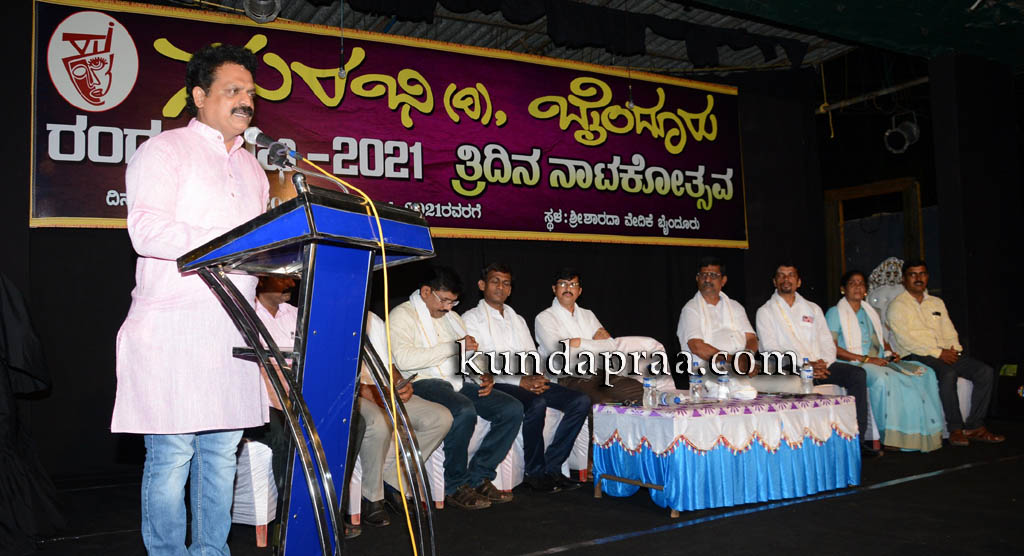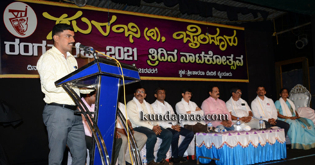 ಅವರು ಭಾನುವಾರ ಇಲ್ಲಿನ ಶಾರದಾ ವೇದಿಕೆಯಲ್ಲಿ ಸುರಭಿ ರಿ. ಬೈಂದೂರು ಆಶ್ರಯದಲ್ಲಿ ಆಯೋಜಿಸಲಾದ ರಂಗಸುರಭಿ 2021 ಮೂರು ದಿನಗಳ ನಾಟಕೋತ್ಸವದ ಎರಡನೇ ದಿನದ ಕಾರ್ಯಕ್ರಮದಲ್ಲಿ ದಿನದ ಗೌರವ ಸ್ವೀಕರಿಸಿ ಮಾತನಾಡಿ ಕನ್ನಡದ ಮೇರು ಕೃತಿಗಳನ್ನು ರಂಗಕ್ಕೆ ತರುವ ಮೂಲಕ ಸುರಭಿ ಸಂಸ್ಥೆಯು ಹೊಸ ಪ್ರಯತ್ನಗಳಿಗೆ ತೆರೆದುಕೊಳ್ಳುತ್ತಲೇ ಬಂದಿರುವುದು ಶ್ಲಾಘನಾರ್ಹ ಎಂದರು.