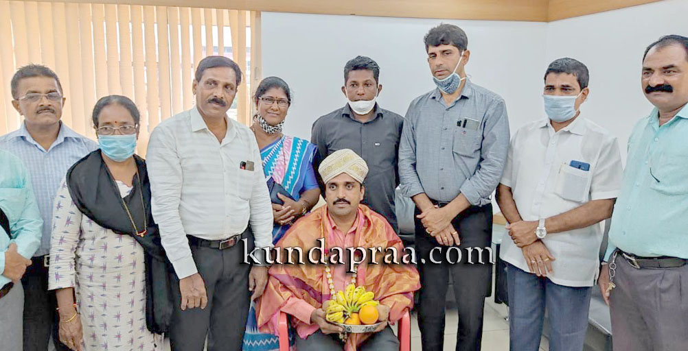 ಕುಂದಾಪುರ: ಪದ್ಮಾಸನ ಭಂಗಿಯಲ್ಲಿ ಕಾಲಿಗೆ ಸರಪಳಿ ಬಿಗಿದು 1 ಕಿ.ಮೀ.ದೂರವನ್ನು 25 ನಿಮಿಷ 16 ಸೆಕೆಂಡುಗಳಲ್ಲಿ ಈಜಿ ಇಂಡಿಯಾ ಬುಕ್ ಆಫ್ ರೆಕಾರ್ಡ್ನಲ್ಲಿ ಹೆಸರು ದಾಖಲಿಸಿದ ಗುಜ್ಜಾಡಿ ಗ್ರಾಮದ ಕಂಚುಗೋಡಿನ ನಿವಾಸಿ, ಪದವೀಧರ ಶಿಕ್ಷಕ ನಾಗರಾಜ ಖಾರ್ವಿ ಅವರನ್ನು ಮಂಗಳೂರು ಮಹಾನಗರ ಪಾಲಿಕೆಯ ಮೇಯರ್ ಪ್ರೇಮಾನಂದ ಶೆಟ್ಟಿ ಸನ್ಮಾನಿಸಿದರು.