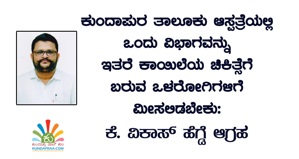 ತಾಲ್ಲೂಕು ಆಸ್ಪತ್ರೆಗೆ ಚಿಕಿತ್ಸೆಗೆ ಬರುವ ಹೆಚ್ಚಿನವರು ಆರ್ಥಿಕವಾಗಿ ಹಿಂದುಳಿದವರು, ಇವರಿಗೆ ಖಾಸಗಿ ಆಸ್ಪತ್ರೆಗಳಿಗೆ ಹೋಗಿ ಚಿಕಿತ್ಸೆ ಪಡೆಯಲು ಇವರಲ್ಲಿ ಸಾಮರ್ಥ್ಯವಿರುವುದಿಲ್ಲಾ ಹಾಗೂ ಕುಂದಾಪುರದ ಸರ್ಕಾರಿ ಆಸ್ಪತ್ರೆಗೆ ಬರುವ ರೋಗಿಗಳಿಗೆ ಉಡುಪಿ ಜಿಲ್ಲಾಸ್ಪತ್ರೆಗೆ ಹೋಗುಲು ಹೇಳುತ್ತಿದ್ದು ಅಲ್ಲೂ ಹಾಸಿಗೆ ಇನ್ನಿತರ ಸಮಸ್ಯೆಗಳು ಇರುವ ಬಗ್ಗೆ ರೋಗಿಗಳು ಹಾಗೂ ಅವರ ಸಂಬಂಧಿಕರು ನೋವನ್ನು ತೋಡಿಕೊಳ್ಳುತ್ತಿದ್ದಾರೆ. ಆದ್ದರಿಂದ ಸಂಬಂಧಿತರು ಕೂಡಲೇ ಕುಂದಾಪುರದ ಸರ್ಕಾರಿ ಆಸ್ಪತ್ರೆಯಲ್ಲೇ ಇತರೆ ಕಾಯಿಲೆಗೆ ಚಿಕಿತ್ಸೆಗೆ ಬರುವವರಿಗೆ ಅವಕಾಶ ಮಾಡಿಕೊಡಿ ಎಂದು ವಿಕಾಸ್ ಹೆಗ್ಡೆ ಆಗ್ರಹಿಸಿದ್ದಾರೆ.