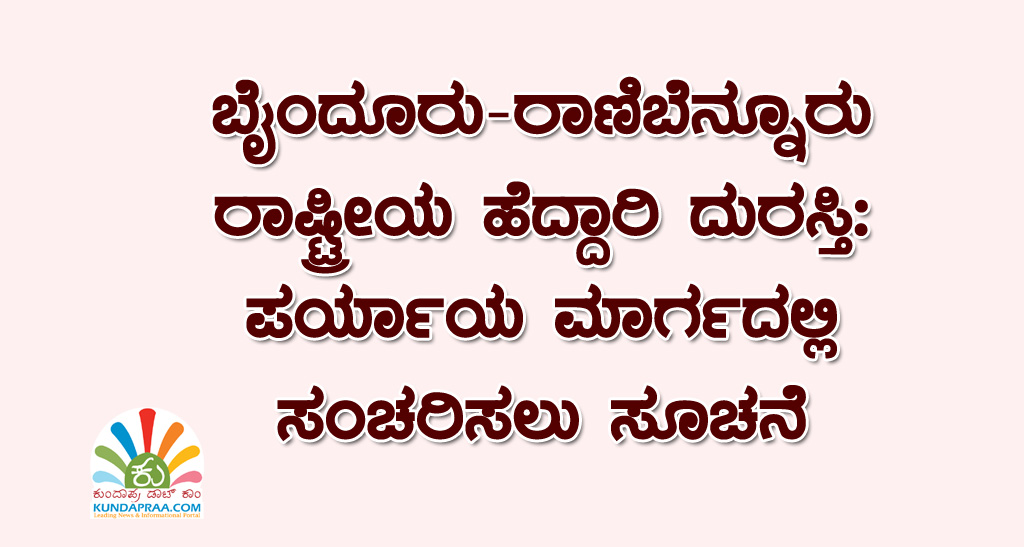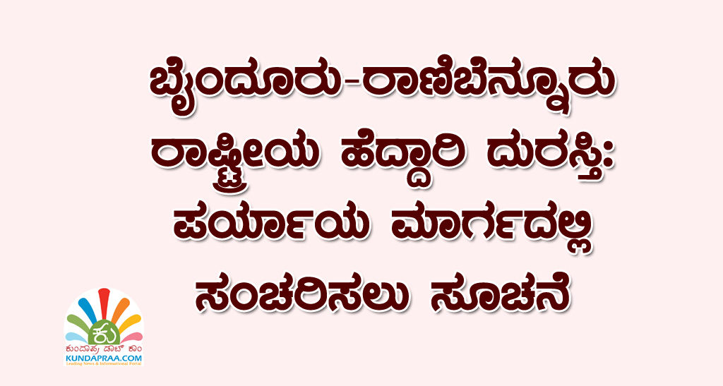 ಬೈಂದೂರು-ರಾಣಿಬೆನ್ನೂರು ರಾಷ್ಟ್ರೀಯ ಹೆದ್ದಾರಿ ದುರಸ್ತಿ: ಪರ್ಯಾಯ ಮಾರ್ಗದಲ್ಲಿ ಸಂಚರಿಸಲು ಸೂಚನೆ