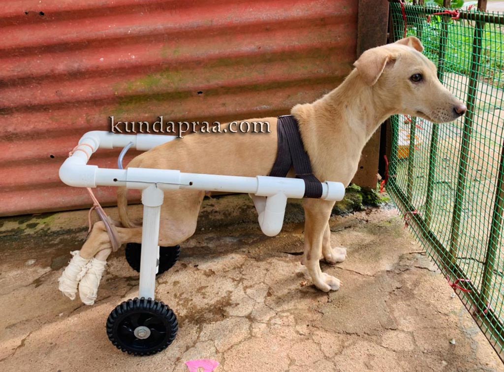 ಎರಡು ಉದ್ದದ ಪಿಯುಸಿ ಪೈಪಿಗೆ ಹೊಟ್ಟೆ ಕೆಳಭಾಗಕ್ಕೆ ವೀ ಬೆಂಡ್ ಮತ್ತು ಹಿಂಭಾಗದಲ್ಲಿ ಬೆಂಡ್ ಪೈಪ್ ಜೋಡಿಸಿ ಸೊಂಟದ ಎರಡೂ ಬದಿಯಲ್ಲಿ ಪೈಪ್ ಜೋಡಿಸಿದರು. ನೆಲಕ್ಕೆ ಮುಖಮಾಡಿದ ಪೈಪಿಗೆ ಎರಡೂ ಕಡೆ ತೂತು ಕೊರೆದು ಬೋಲ್ಟ್ ನಟ್ ಅಳವಡಿಸಿ ಗಾಲಿ ಜೋಡಿಸಿ, ಕತ್ತಿನ ಬಳಿ ಬೆಲ್ಟ್ ಹಾಕಿ ಎದೆ ಭಾಗದಲ್ಲಿ ಬಿಗಿದು, ಹಿಂಗಾಲು ಬೆನ್ನಿನ ಹಿಂದಿನ ಪೈಪಿಗೆ ಆತುಕೊಳ್ಳುವಂತೆ ಮಾಡಿದರು. ಗಾಲಿಗಾಡಿ ನಾಯಿಗೆ ಕಟ್ಟಿ ಓಡಾಟ ಅಭ್ಯಾಸ ಕೂಡಾ ಮಾಡಿಸಿದರು. ನಾಯಿ ಈಗ ಗಾಲಿ ಗಾಡಿಯಲ್ಲಿ ಎಲ್ಲೆಂದರಲ್ಲಿ ಸಂಚರಿಸುತ್ತದೆ. ಪ್ರಿಯಾ ಅವರನ್ನು ಹಿಂಬಾಲಿಸುತ್ತದೆ.