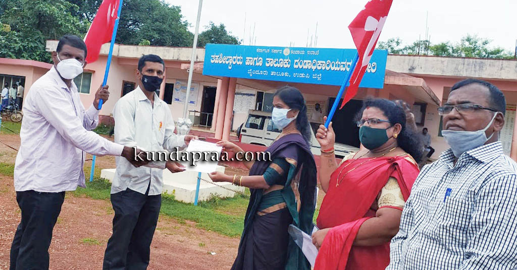 ಕೊರೊನಾ ಪರಿಹಾರ ಪ್ರತಿ ಕಾಮಿ೯ಕರಿಗೆ 10000ರೂ. ನೀಡಬೇಕು. ಮೊದಲಾದ ಬೇಡಿಕೆಗಳನ್ನು ಈಡೇರಿಸಲು ಒತ್ತಾಯಿಸಿ ಸೆಂಟರ್ ಆಪ್ ಇಂಡಿಯನ್ ಟ್ರೇಡ್ ಯೂನಿಯನ್ಸ್ (ಸಿಐಟಿಯು)ರಾಜ್ಯ ಸಮಿತಿಯ ಕರೆಯ ಮೇರೆಗೆ ಬೈಂದೂರು ತಾಲೂಕು ಸಿಐಟಿಯು ಕಾಮಿ೯ಕ ಸಂಘಗಳ ನೇತೃತ್ವದಲ್ಲಿ ಇಂದು ಬೈಂದೂರು ತಹಶೀಲ್ದಾರ್ ಕಚೇರಿ ಎದುರು ಕಾಮಿ೯ಕರ ಬೃಹತ್ ಪ್ರತಿಭಟನೆ ನಡೆಯಿತು.