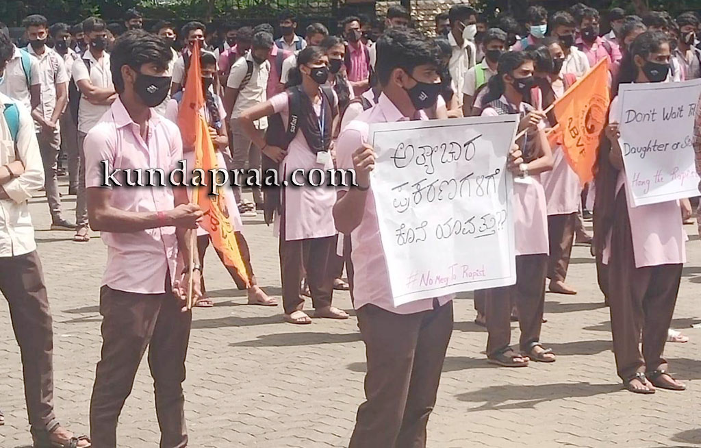 ಕುಂದಾಪುರ: ಎಳೆ ವಯಸ್ಸಿನಿಂದ ಮಕ್ಕಳಿಂದ ಇಳಿ ವಯಸ್ಸಿನ ಮಹಿಳೆಯವರೆಗೂ ನಡೆದ ಅತ್ಯಾಚಾರ ಪ್ರಕರಣಗಳನ್ನು ಖಂಡಿಸಿ, ಅತ್ಯಾಚಾರಗೈದ ಅಪರಾಧಿಗಳಿಗೆ ಕಠಿಣ ಶಿಕ್ಷೆಯಾಗುವಂತೆ ಆಗ್ರಹಿಸಿ ಅಖಿಲ ಭಾರತ ವಿದ್ಯಾರ್ಥಿ ಪರಿಷತ್, ಮಂಗಳೂರು ಇವರ ನೇತೃತ್ವದಲ್ಲಿ ಕುಂದಾಪುರದಲ್ಲಿ ಪ್ರತಿಭಟನೆ ನಡೆಯಿತು.