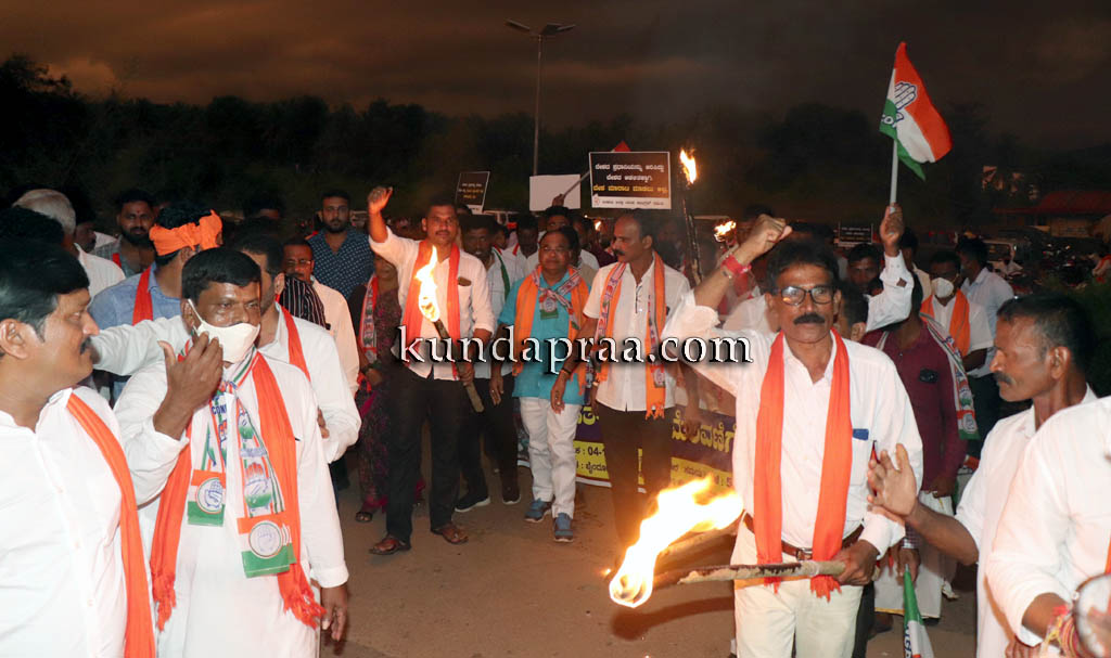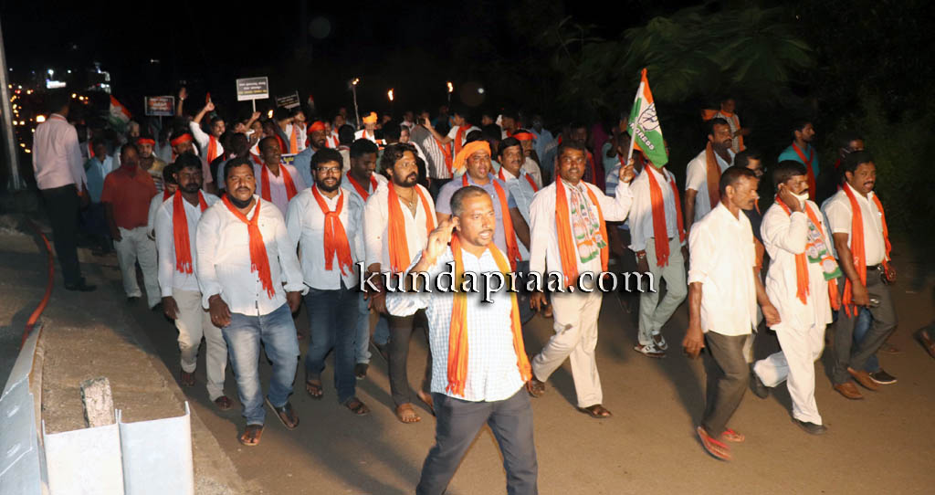 ಬೈಂದೂರು: ನಂಜನಗೂಡಿನ ಪುರಾತನ ಹಿಂದೂ ದೇವಾಲಯ ಸೇರಿದಂತೆ ವಿವಿಧ ಧಾರ್ಮಿಕ ಕೇಂದ್ರಗಳನ್ನು ಬಿಜೆಪಿ ಸರಕಾರ ಕೆಡುವುತ್ತಿದ್ದ ಎಂದು ಆಪಾದಿಸಿ ಬೈಂದೂರು ಯುವ ಕಾಂಗ್ರೆಸ್ ನೇತೃತ್ವದಲ್ಲಿ ಸೋಮವಾರ ಪಂಜಿನ ಮೆರವಣಿಗೆ ನಡೆಯಿತು. ಹೊಸ ಬಸ್ ನಿಲ್ದಾಣದಿಂದ ಸೇನೇಶ್ವರ ದೇವಸ್ಥಾನದ ತನಕ ಪಂಜಿನ ಮೆರವಣಿಗೆ ನಡೆಸಿ ಬಿಜೆಪಿ ಸರಕಾರದ ನೀತಿ-ಧೋರಣೆಯನ್ನು ಖಂಡಿಸಲಾಯಿತು.