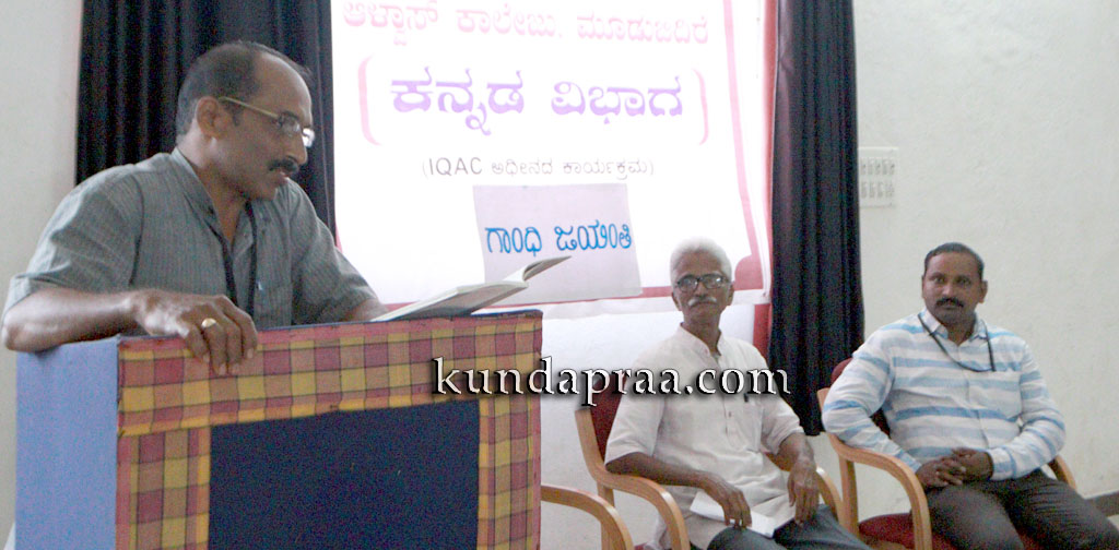 ಸ್ವಾಸ್ಥ್ಯ ಸಮಾಜಕ್ಕೆ ಗಾಂಧಿ ತತ್ವಗಳು ಅವಶ್ಯ ಎಂದು ಆಳ್ವಾಸ್ ಕಾಲೇಜಿನ ಕನ್ನಡ ವಿಭಾಗದ ಪ್ರಾಧ್ಯಾಪಕ ಡಾ. ಕೃಷ್ಣರಾಜ ಕರಬ ಹೇಳಿದರು.