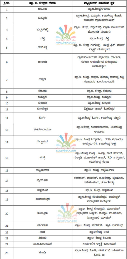 ಕುಂದಾಪುರ ಹಾಗೂ ಬೈಂದೂರು ತಾಲೂಕಿನ ಪ್ರಾಥಮಿಕ ಆರೋಗ್ಯ ಕೇಂದ್ರ ಹಾಗೂ ವ್ಯಾಕ್ಸಿನೇಶನ್ ನಡೆಯುವ ಸ್ಥಳದ ಮಾಹಿತಿ ಈ ಕೆಳಗಿನಂತಿದೆ.