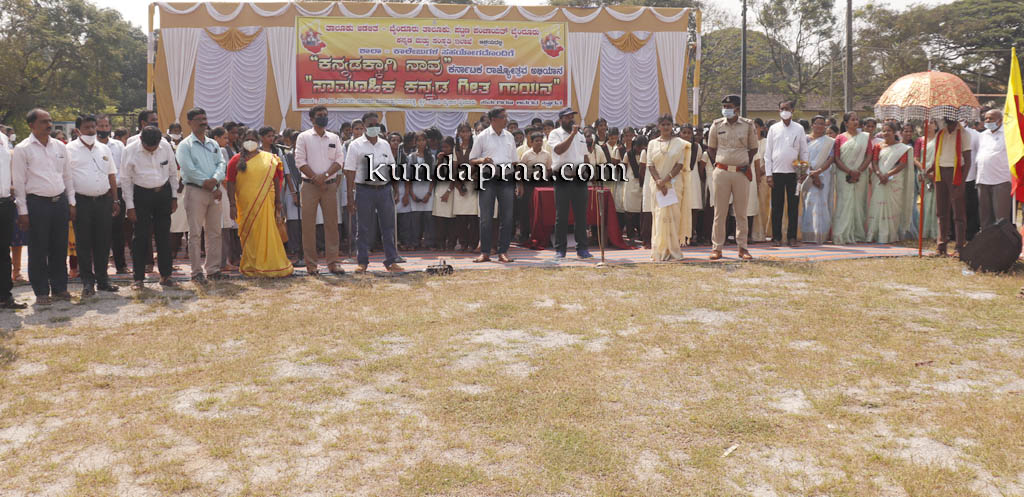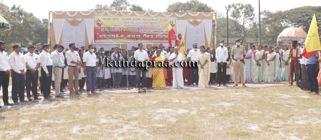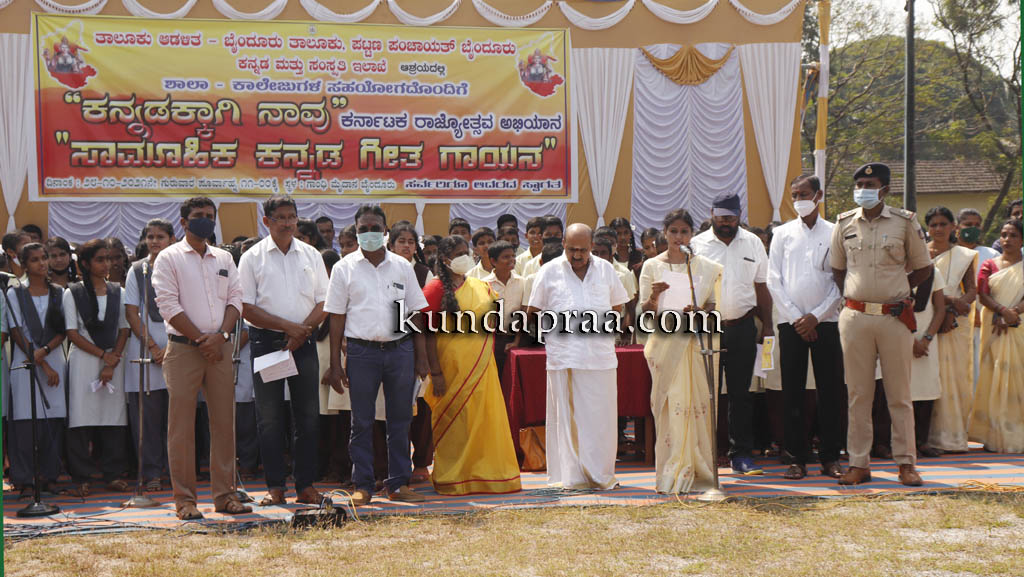 ಬೈಂದೂರು ತಾಲೂಕು ದಂಡಾಧಿಕಾರಿ ಶೋಭಾಲಕ್ಷ್ಮೀ ಸ್ವಾಗತಿಸಿ ಪ್ರಾಸ್ತಾವಿಕ ಮಾತುಗಳನ್ನಾಡಿದರು. ಬೈಂದೂರು ಸರಕಾರಿ ಪದವಿಪೂರ್ವ ಕಾಲೇಜು ಹಾಗೂ ಹೈಸ್ಕೂಲು ವಿದ್ಯಾರ್ಥಿಗಳು, ರತ್ತೂಬಾಯಿ ಜನತಾ ಪ್ರೌಢಶಾಲೆ, ಯುಬಿ ಶೆಟ್ಟಿ ಶಾಲೆಯ ವಿದ್ಯಾರ್ಥಿಗಳು ಸಮೂಹ ಗಾಯನದಲ್ಲಿ ಪಾಲ್ಗೊಂಡರು. ಆರಂಭದಲ್ಲಿ ನಾಡಗೀತ ಬಳಿಕ ನಿಗದಿಪಡಿಸಿದ ಮೂರು ಕನ್ನಡಗೀತೆ ಹಾಗೂ ಕೊನೆಯಲ್ಲಿ ರಾಷ್ಟ್ರಗೀತೆ ಹಾಡಲಾಯಿತು. 600ಕ್ಕೂ ಅಧಿಕ ವಿದ್ಯಾರ್ಥಿಗಳು ಪಾಲ್ಗೊಂಡರು. ಸಂಗೀತ ನಿರ್ದೇಶಕ ಚಂದ್ರ ಬಂಕೇಶ್ವರ್ ವಿದ್ಯಾರ್ಥಿಗಳನ್ನು ತರಬೇತುಗೋಳಿಸಿದ್ದರು.