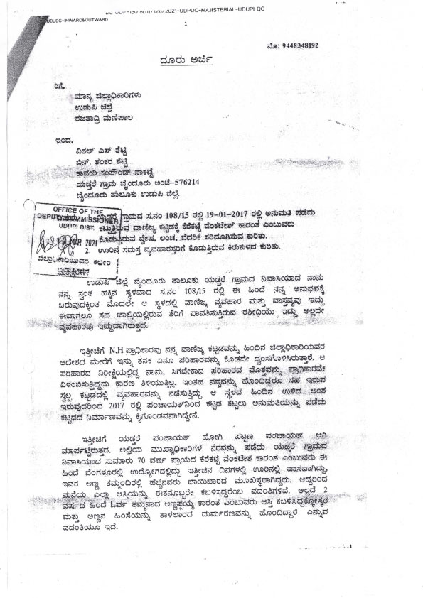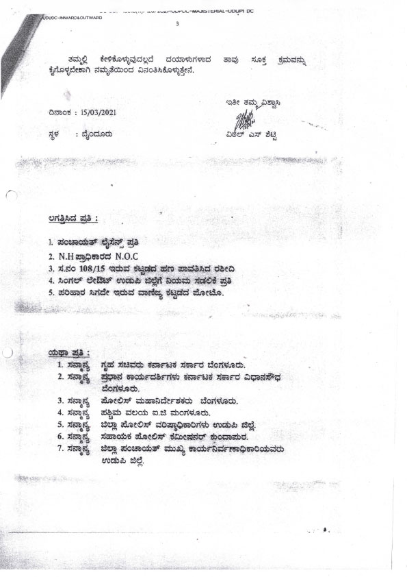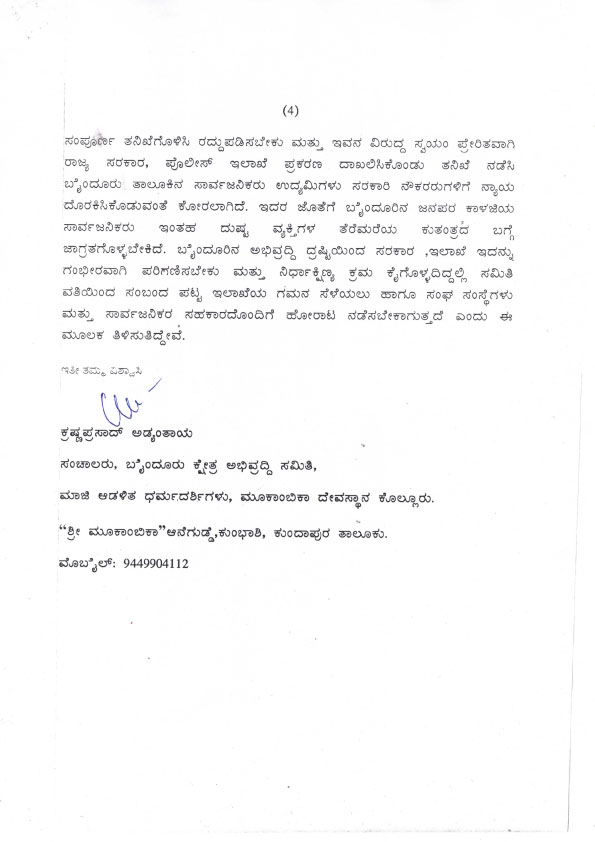 ಇದರ ಜೊತೆಗೆ ಬೈಂದೂರಿನ ಜನಪರ ಕಾಳಜಿಯ ಸಾರ್ವಜನಿಕರು ಇಂತಹ ವ್ಯಕ್ತಿಗಳ ತೆರೆಮರೆಯ ಕುತಂತ್ರದ ಬಗ್ಗೆ ಜಾಗ್ರತಗೊಳ್ಳಬೇಕಿದೆ. ಬೈಂದೂರಿನ ಅಭಿವೃದ್ಧಿ ದೃಷ್ಟಿಯಿಂದ ಸರಕಾರ, ಇಲಾಖೆ ಇದನ್ನು ಗಂಭೀರವಾಗಿ ಪರಿಗಣಿಸಬೇಕು ಮತ್ತು ನಿರ್ದಾಕ್ಷಿಣ್ಯ ಕ್ರಮ ಕೈಗೊಳ್ಳದಿದ್ದಲ್ಲಿ ಸಮಿತಿ ವತಿಯಿಂದ ಸಂಬಂಧ ಪಟ್ಟ ಇಲಾಖೆಯ ಗಮನ ಸೆಳೆಯಲು ಹಾಗೂ ಸಂಘ ಸಂಸ್ಥೆಗಳು ಮತ್ತು ಸಾರ್ವಜನಿಕರ ಸಹಕಾರದೊಂದಿಗೆ ಹೋರಾಟ ನಡೆಸಬೇಕಾಗುತ್ತದೆ ಎಂದು ಕೃಷ್ಣಪ್ರಸಾದ್ ಅಡ್ಯಂತಾಯ ಅವರು ದೂರಿನಲ್ಲಿ ತಿಳಿಸಿದ್ದಾರೆ.