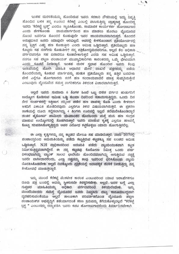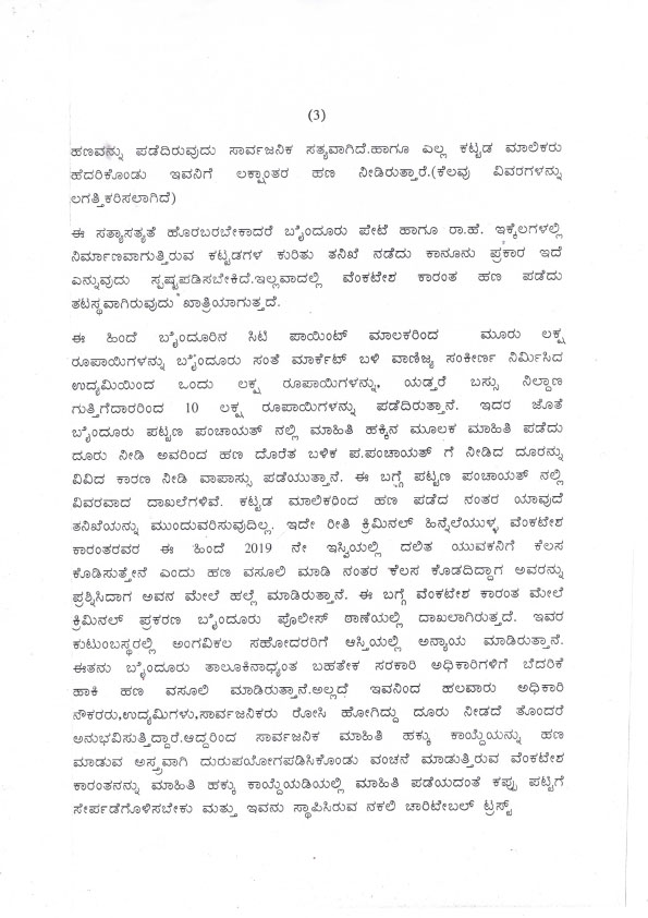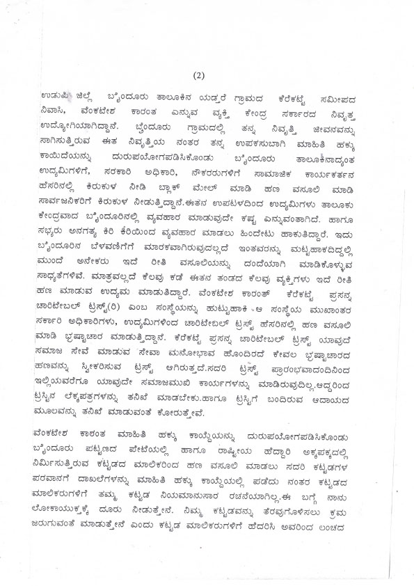‘ಹಿಂದೆ 2019 ನೇ ಇಸ್ವಿಯಲ್ಲಿ ದಲಿತ ಯುವಕನಿಗೆ ಕೆಲಸ ಕೊಡಿಸುತ್ತೇನೆ ಎಂದು ಹಣ ವಸೂಲಿ ಮಾಡಿ ನಂತರ ಕೆಲಸ ಕೊಡದಿದ್ದಾಗ ಅವರನ್ನು ಪ್ರಶ್ನಿಸಿದಾಗ ಅವನ ಮೇಲೆ ಹಲ್ಲೆ ಮಾಡಿರುತ್ತಾನೆ. ಈ ಬಗ್ಗೆ ವೆಂಕಟೇಶ ಕಾರಂತ ಮೇಲೆ ಕ್ರಿಮಿನಲ್ ಪ್ರಕರಣ ಬೈಂದೂರು ಪೊಲೀಸ್ ಠಾಣೆಯಲ್ಲಿ ದಾಖಲಾಗಿರುತ್ತದೆ. ಇವರ ಕುಟುಂಬಸ್ಥರಲ್ಲಿ ಅಂಗವಿಕಲ ಸಹೋದರರಿಗೆ ಆಸ್ತಿಯಲ್ಲಿ ಅನ್ಯಾಯ ಮಾಡಿರುತ್ತಾನೆ. ಇವರಿಂದ ಹಲವಾರು ಅಧಿಕಾರಿ ನೌಕರರು, ಉದ್ಯಮಿಗಳು, ಸಾರ್ವಜನಿಕರು ರೋಸಿ ಹೋಗಿದ್ದು ದೂರು ನೀಡದೆ ತೊಂದರೆ ಅನುಭವಿಸುತ್ತಿದ್ದಾರೆ. ಆದ್ದರಿಂದ ಸಾರ್ವಜನಿಕ ಮಾಹಿತಿ ಹಕ್ಕು ಕಾಯ್ದೆಯನ್ನು ಹಣ ಮಾಡುವ ಅಸ್ತ್ರವಾಗಿ ದುರುಪಯೋಗಪಡಿಸಿಕೊಂಡು ವಂಚನೆ ಮಾಡುತ್ತಿರುವ ವೆಂಕಟೇಶ ಕಾರಂತನನ್ನು ಮಾಹಿತಿ ಹಕ್ಕು ಕಾಯ್ದೆಯಡಿಯಲ್ಲಿ ಮಾಹಿತಿ ಪಡೆಯದಂತೆ ಕಪ್ಪು ಪಟ್ಟಿಗೆ ಸೇರ್ಪಡೆಗೊಳಿಸಬೇಕು ಮತ್ತು ಇವನು ಸ್ಥಾಪಿಸಿರುವ ನಕಲಿ ಚಾರಿಟೇಬಲ್ ಟ್ರಸ್ಟ್ ಸಂಪೂರ್ಣ ತನಿಖೆಗೊಳಿಸಿ ರದ್ದು ಪಡಿಸಬೇಕು ಮತ್ತು ಇವನ ವಿರುದ್ದ ಸ್ವಯಂ ಪ್ರೇರಿತವಾಗಿ ರಾಜ್ಯ ಸರಕಾರ, ಪೊಲೀಸ್ ಇಲಾಖೆ ಪ್ರಕರಣ ದಾಖಲಿಸಿಕೊಂಡು ತನಿಖೆ ನಡೆಸಿ ಬೈಂದೂರು ತಾಲೂಕಿನ ಸಾರ್ವಜನಿಕರು ಉದ್ಯಮಿಗಳು ಸರಕಾರಿ ನೌಕರರುಗಳಿಗೆ ನ್ಯಾಯ ದೊರಕಿಸಿಕೊಡುವಂತೆ ದೂರಿನಲ್ಲಿ ಕೋರಲಾಗಿದೆ.