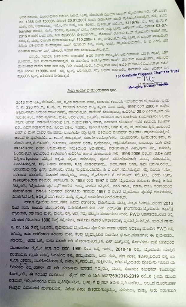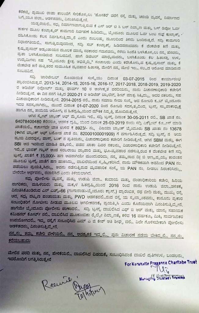 ನಾನು ಕೇಂದ್ರ ಹಾಗೂ ರಾಜ್ಯ ಸರಕಾರದಿಂದ ಸಂವಿಧಾನದತ್ತ ಮಾಹಿತಿ ಕಾನೂನು ಅಧಿನಿಯಮದ, ನಿಯಮವನ್ನು ಸಿವಿಲ್ ಸಮಾಜದ ಒಳಿತಿಗಾಗಿಯೇ ಬಳಸುತ್ತಿದ್ದು, ಸದ್ರಿ ಅಧಿನಿಯಮದ ಕಾನೂನನ್ನು ಇಲ್ಲಿಯವರೆಗೂ ದುರ್ಬಳಕೆ ಮಾಡಿದ್ದಿಲ್ಲ. ಸಂವಿಧಾನದತ್ತ ಪಡೆದ ಮಾಹಿತಿಯಿಂದ ಯಾರನ್ನೂ ಹಣಕ್ಕಾಗಿ ಇಲ್ಲಿಯವರೆಗೂ ನಾನು ಪೀಡಿಸಿದ್ದಿಲ್ಲ. ಅಥವಾ ನನ್ನ ಪರವಾಗಿ ಅಂತಹ ಅಥವಾ ಬೇರೆಯೇ ಆದ ವಾಮ ಮಾರ್ಗದಲ್ಲಿ ಸಿಗುವ ಹಣ ಪಡೆಯುವ ಬಗ್ಗೆ ಇತರ ಯಾರನ್ನೂ ನನ್ನ ಮತ್ತು ನನ್ನ ಟ್ರಸ್ಟ್ ಪರವಾಗಿ ನೇಮಿಸಿಲ್ಲ. 2014 ರಿಂದ ಸಿವಿಲ್ ಸಮಾಜದಲ್ಲಿ ಮಧ್ಯಮ ವರ್ಗದವರನ್ನು ನಂಬಿಸಿ ಇ-ಸ್ವತ್ತು ಭೂ-ವ್ಯವಹಾರ ಮಾಡುವ ದಂದೆ ಈ ಪ್ರದೇಶದಲ್ಲಿ ಸಕತ್ತಾಗಿ ನಡೆದಿರುತ್ತದೆ. ಬೈಂದೂರು ಮತ್ತು ಯಡ್ತರೆ ಗ್ರಾಮದ ಸಮಘೃ ಸರ್ವೇ ನಕ್ಷೆಯು ಬೈಂದೂರು ಪಟ್ಟಣ ಪಂಚಾಯತು ಕಚೇರಿ ವ ತಹಸಿಲ್ದಾರ್ ಕಚೇರಿಯಲ್ಲಿ ಇಲ್ಲ ಎಂದು ಇತ್ತೀಚಿನ ಮಾಹಿತಿಯಿಂದ ತಿಳಿದು ಬಂದಿರುತ್ತದೆ. ಕೆ ವೆಂಕಟೇಶ ಕಿಣಿ ದಿನಾಂಕ 16.06.2015 ರಂದು ಅವರಾಗಿಯೇ ನನ್ನ ತಮ್ಮ ದಿ| ಬಿ ಅಣ್ಣಪ್ಪಯ್ಯ ಕಾರಂತನ ಸಹಾಯದಿಂದ ಎಸ್ ಬಿ ಐ ಯಡ್ತರೆ ಟ್ರಸ್ಟ್ ಖಾತೆಗೆ ₹35,000/-ಜಮಾ ಮಾಡಿಸಿರುತ್ತಾನೆ. 2016-17 ದ ಆರ್ಥಿಕ ವರ್ಷದ ಅಂತ್ಯದ ವರೆಗೂ ಸದ್ರಿ ಭೂ ವ್ಯವಹಾರಿ ಸಂಬಂಧಿಸಿದ ವಾಣಿಜ್ಯ ಸಂಸ್ಥೆಯ PAN ಸಂಖ್ಯೆಯನ್ನು ನೀಡಲು ನಿರಾಕರಿಸಿ, ನನ್ನನ್ನು ಹೀಯಾಳಿಸಿರುತ್ತಾನೆ. ಕುಂಜಾಲು ವೆಂಕಟೇಶ ಕಿಣಿ ಗ್ಯಾಸ್ ಅಂಡೆ ವ್ಯವಹಾರದೊಂದಿಗೆ ಈ ಪ್ರದೇಶದಲ್ಲಿ ವಾಣಿಜ್ಯ ಸಂಸ್ಥೆಳಾದ ಚಿತ್ರಾಪುರ ಡೆವಲಪರ್ಸ್, ಮೂಕಾಂಬಿಕಾ ಡೆವಲಪರ್ಸ್, ಸೌಪರ್ಣಿಕಾ ಡೆವಲಪರ್ಸ್ ಮತ್ತು ಇನ್ನಿತರ ವಾಣಿಜ್ಯ ಸಂಸ್ಥೆಗಳನ್ನು ಹುಟ್ಟು ಹಾಕಿಕೊಂಡು ಭೂ-ವ್ಯವಹಾರ ಮತ್ತು ವಾಣಿಜ್ಯ ಕಟ್ಟಡ ನಿರ್ಮಾಣ ಕಾರ್ಯವನ್ನು ಮಾಡುತ್ತಿದ್ದಾನೆ. ಅವರಾಗಿಯೇ ಖಾತೆಗೆ ಜಮಾ ಮಾಡಿಸಿದ ಹಣದ ಮೂಲವನ್ನು ಟ್ರಸ್ಟ ಗೆ ತಿಳಿಸದೆ ಈಗ ನನ್ನನ್ನು ಹಫ್ತಾ ವಸೂಲಿ ಮಾಡುವವ ಅಂತ ಸಮಾಜದಲ್ಲಿ ಬಿಂಬಿಸುವುದು ಕಾನೂನು ಪ್ರಕಾರ ದೇಶದ ಖಜಾನೆಗೆ ನಷ್ಟ ಉಂಟುಮಾಡಿರುತ್ತಾನೆ ಎಂದು ತಿಳಿಯಬೇಕಾಗಿರುತ್ತದೆ. ಆ ನೆಲೆಯಲ್ಲಿ ಈತನು ಮತ್ತು ಈತನ ಭೂ-ವ್ಯವಹಾರದಲ್ಲಿ ಪಾರ್ಟ್ನರ್ ಆಗಿರುವ “ಬೈಂದೂರು ಕ್ಷೇತ್ರ ಅಭಿವೃದ್ದಿ ಸಂಚಾಲರು” ಎಂದು ಕರೆಸಿಕೊಳ್ಳುವ ಕುಂದಾಪುರ ಪೋಲೀಸು ಸರಹದ್ದಿನಲ್ಲಿ ವಾಸಿಸುತ್ತಿರುವ ಕ್ರಷ್ಣಪ್ರಸಾದ್ ಅಡ್ಯಂತಾಯ ಮತ್ತು ಗುರುರಾಜ ಬಿನ್ ನರಶಿಂಹ ಕಲ್ಕಂಟಮನೆ ಇವರೆಲ್ಲರ ಮೂಲಕ ಸಂಚಾರಿ ಸಂಪರ್ಕದಲ್ಲಿನ Whatspp ಸುದ್ದಿ ಮಾಧ್ಯಮದಲ್ಲಿ ಮತ್ತು ಡಿಜಿಟಲ್ ಸುದ್ದಿ ಮಾಧ್ಯಮದಲ್ಲಿ ಕ್ರಷ್ಣಪ್ರಸಾದ್ ಅಡ್ಯಂತಾಯ ಸಹಿ ಮಾಡಿದ್ದೆನ್ನಲಾದ ಪತ್ರದ ಯಥಾ ವಿಷಯವನ್ನು ಅಪ್ ಲೋಡ್ ಮಾಡಿಸಿರುತ್ತಾರೆ ಎಂದು ಕೆ. ವೆಂಕಟೇಶ್ ಕಾರಂತ್ ತಿಳಿಸಿದ್ದಾರೆ.