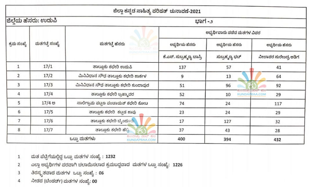ಚುನಾವಣೆಯಲ್ಲಿ ಮೂವರು ಅಭ್ಯರ್ಥಿಗಳು ಸ್ವರ್ಧಿಸಿದ್ದು ನೀಲಾವರ ಸುರೇಂದ್ರ ಅಡಿಗ- 437, ಸುಬ್ರಹ್ಮಣ್ಯ ಬಾಸ್ರಿ- 400, ಸುಬ್ರಹ್ಮಣ್ಯ ಭಟ್- 394 ಮತಗಳನ್ನು ಪಡೆದಿದ್ದಾರೆ.