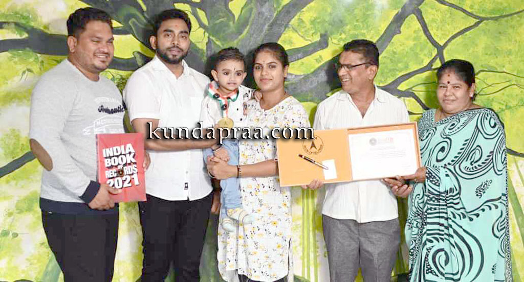 ಬೈಂದೂರು: ಉಪ್ಪುಂದ ಮೂಲದ 1.6 ವರ್ಷದ ಪೋರಿ ಅಗಮ್ಯ ಎಂ. ಶೆಟ್ಟಿ ತನ್ನ ವಿಶೇಷ ಬುದ್ಧಿಶಕ್ತಿ ಹಾಗೂ ನೆನಪಿನ ಶಕ್ತಿಯಿಂದ ಭಾರತದ ಪ್ರತಿಷ್ಠಿತ ಇಂಡಿಯಾ ಬುಕ್ ಆಫ್ ರೆಕಾರ್ಡ್ಗೆ ಸೇರ್ಪಡೆ ಯಾಗಿದ್ದಾರೆ.