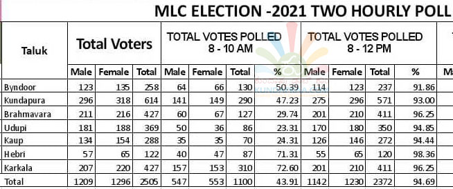 ವಿಧಾನ ಪರಿಷತ್ ಚುನಾವಣೆ: ಉಡುಪಿ ಜಿಲ್ಲೆಯಲ್ಲಿ 12 ಗಂಟೆಯ ತನಕ 94.69% ಮತದಾನ