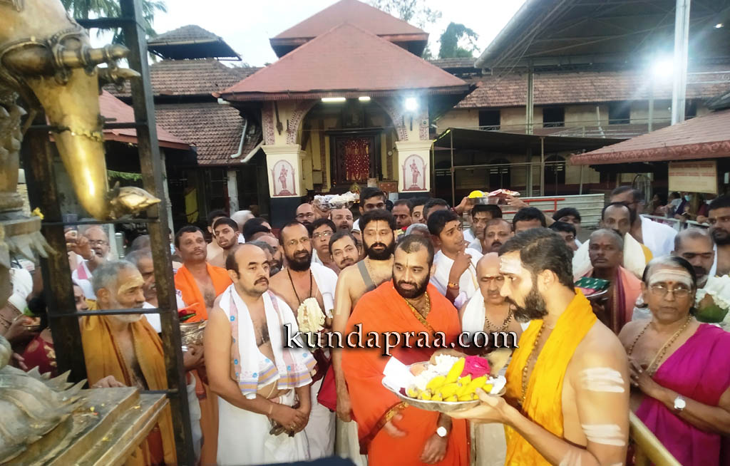 ದೇವಳದ ಪ್ರಧಾನ ಅರ್ಚಕ ಹಾಗೂ ತಂತ್ರಿ ಡಾ. ಕೆ. ರಾಮಚಂದ್ರ ಅಡಿಗ ಹಾಗೂ ಕೆ. ನರಸಿಂಹ ಭಟ್ ಸ್ವಾಮೀಜಿಯವರಿಗೆ ಪೂರ್ಣಕುಂಭ ಸ್ವಾಗತ ನೀಡಿದರು. ದೇವಳದ ಕಾರ್ಯನಿರ್ವಹಣಾಧಿಕಾರಿ ಎಸ್. ಪಿ. ಬಿ. ಮಹೇಶ್ ಮತ್ತು ವ್ಯವಸ್ಥಾಪನಾ ಸಮಿತಿ ಸದಸ್ಯರಾದ ಡಾ. ಅತುಲ್ಕುಮರ್ ಶೆಟ್ಟಿ, ಸಂಧ್ಯಾ ರಮೇಶ್ ದೇವಳದ ವತಿಯಿಂದ ಗೌರವಿಸಿದರು. ಹೊರ ಪ್ರಾಂಗಣದಲ್ಲಿರುವ ಶ್ರೀ ಆಂಜನೇಯ ಸ್ವಾಮಿ ಹಾಗೂ ಶ್ರೀ ವೆಂಕಟರಮಣ ದೇವರ ದರ್ಶನ ಪಡೆದ ಸ್ವಾಮೀಜಿ ಚಿನ್ನದ ರಥವನ್ನು ವೀಕ್ಷಿಸಿದರು.