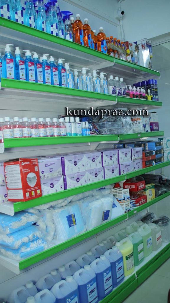 ಪಿಪಿಇ ಕಿಟ್, ರಬ್ಬರ್ ಹ್ಯಾಂಡ್ ಗ್ಲೌಸ್, ಇನ್ಫ್ರಾರೆಡ್ ಥರ್ಮೋಮೀಟರ್, ಸ್ಯಾನಿಟೈಸರ್ ಸ್ಟ್ರೇಯರ್, ಫೇಸ್ ಶೀಲ್ಡ್, ಎನ್-95 ಮಾಸ್ಕ್, ವಾಶೆಬಲ್ ಬ್ರ್ಯಾಂಡೆಡ್ ಮಾಸ್ಕ್, 3ಫೈ ಮಾಸ್ಕ್, ವಾಶೆಬಲ್ ಫೇಸ್ ಮಾಸ್ಕ್, ಸ್ಟ್ರೇ ಸ್ಯಾನಿಟೈಸರ್, ಟರ್ಮರಿಕ್ ಹ್ಯಾಂಡ್ ವಾಶ್, ಹ್ಯಾಂಡ್ ಸ್ಯಾನಿಟೈಸರ್, 5 ಲೀ. ಸ್ಯಾನಿಟೈಸರ್ ಗಳು, ಕಾಟನ್ ಗ್ಲೌಸ್, ಮಕ್ಕಳ ಫೇಸ್ ಮಾಸ್ಕ್ ಲಭ್ಯವಿದೆ.