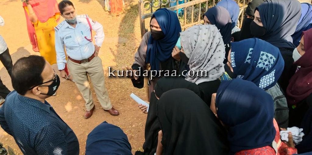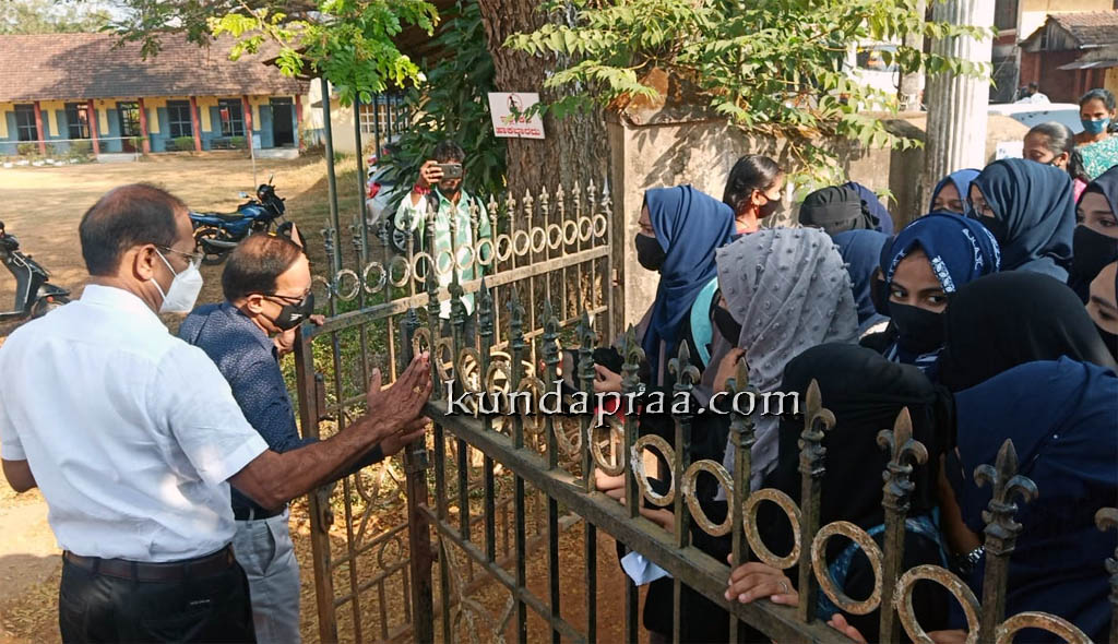 ಕುಂದಾಪುರ: ಇಲ್ಲಿನ ಸರಕಾರಿ ಪದವಿ ಪೂರ್ವ ಕಾಲೇಜಿಗೆ ಹಿಜಾಬ್ ಧರಿಸಿ ಬಂದಿದ್ದ ಮುಸ್ಲಿಂ ಸಮುದಾಯದ ವಿದ್ಯಾರ್ಥಿನಿಯರಿಗೆ ಕಾಲೇಜು ಆವರಣದೊಳಗೆ ಪ್ರವೇಶ ನಿರಾಕರಿಸಿದ ಘಟನೆ ಗುರುವಾರ ಬೆಳಿಗ್ಗೆ ನಡೆದಿದೆ.