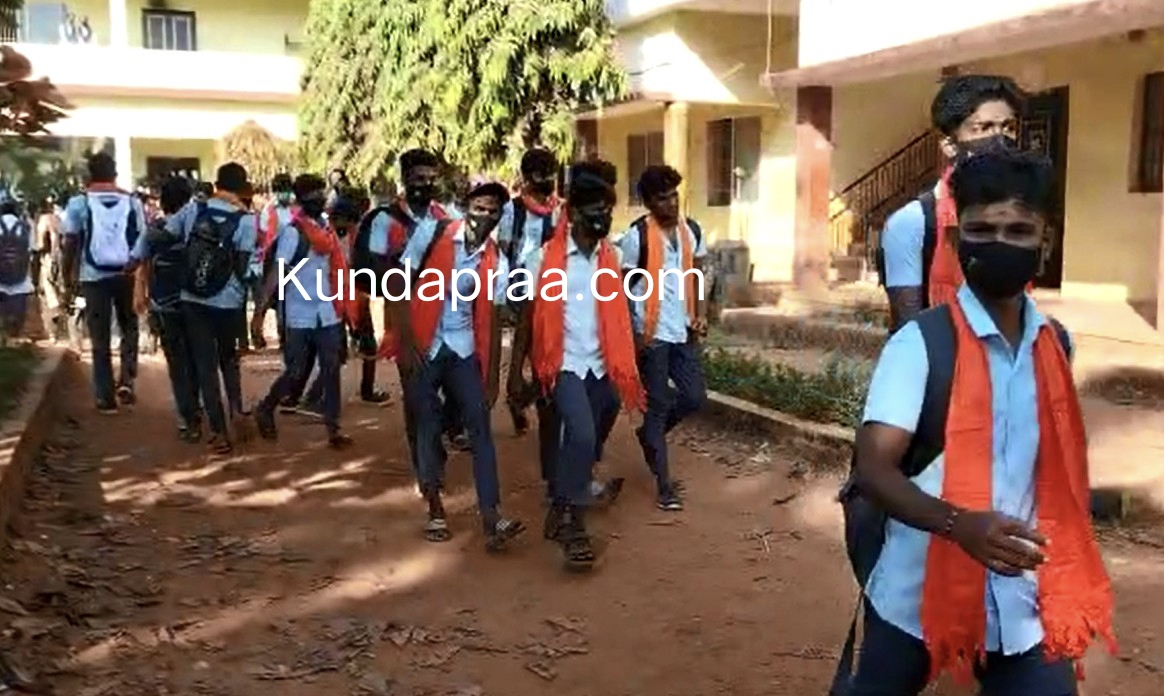 ಬೈಂದೂರಿನ ಸರಕಾರಿ ಪದವಿ ಪೂರ್ವ ಕಾಲೇಜಿನಲ್ಲಿ ವಿದ್ಯಾರ್ಥಿನಿಯರಿಗೆ ಹಿಜಬ್ ಧರಿಸಿ ಕಾಲೇಜು ಪ್ರವೇಶಕ್ಕೆ ಅವಕಾಶ ನೀಡಬಾರದು ಎಂದು ಆಗ್ರಹಿಸಿ ಕಾಲೇಜಿನ ಸುಮಾರು 300ಕ್ಕೂ ಅಧಿಕ ವಿದ್ಯಾರ್ಥಿಗಳು ಕೇಸರಿ ಶಾಲು ಧರಿಸಿ ಬಂದಿದ್ದರು. ಈ ವೇಳೆಯಲ್ಲಿ ಕಾಲೇಜಿನ ಉಪನ್ಯಾಸಕರು ಸಮವಸ್ತ್ರ ಧರಿಸಿದರೆ ಮಾತ್ರವೇ ತರಗತಿಗೆ ಪ್ರವೇಶ ನೀಡುವುದಾಗಿ ತಿಳಿಸಿದ್ದಾರೆ. ಈ ವೇಳೆಯಲ್ಲಿ ಉಪನ್ಯಾಸಕರು ಹಾಗೂ ಸಂಘಟನೆಯ ಕಾರ್ಯಕರ್ತರ ನಡುವೆ ವಾಗ್ವಾದ ನಡೆದಿದೆ. ಅಂತಿಮವಾಗಿ ಹಿಜಾಬ್ ಹಾಗೂ ಕೆಸರಿ ಶಾಲು ಧರಿಸಿದವರನ್ನು ತರಗತಿಗೆ ಪ್ರವೇಶ ನೀಡಲಾಗಿದೆ.