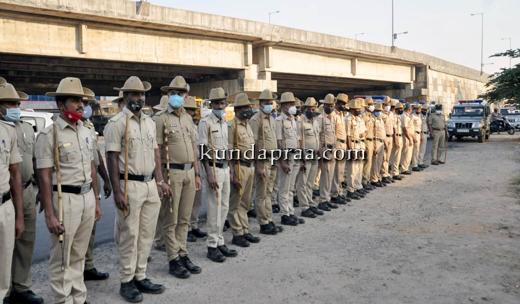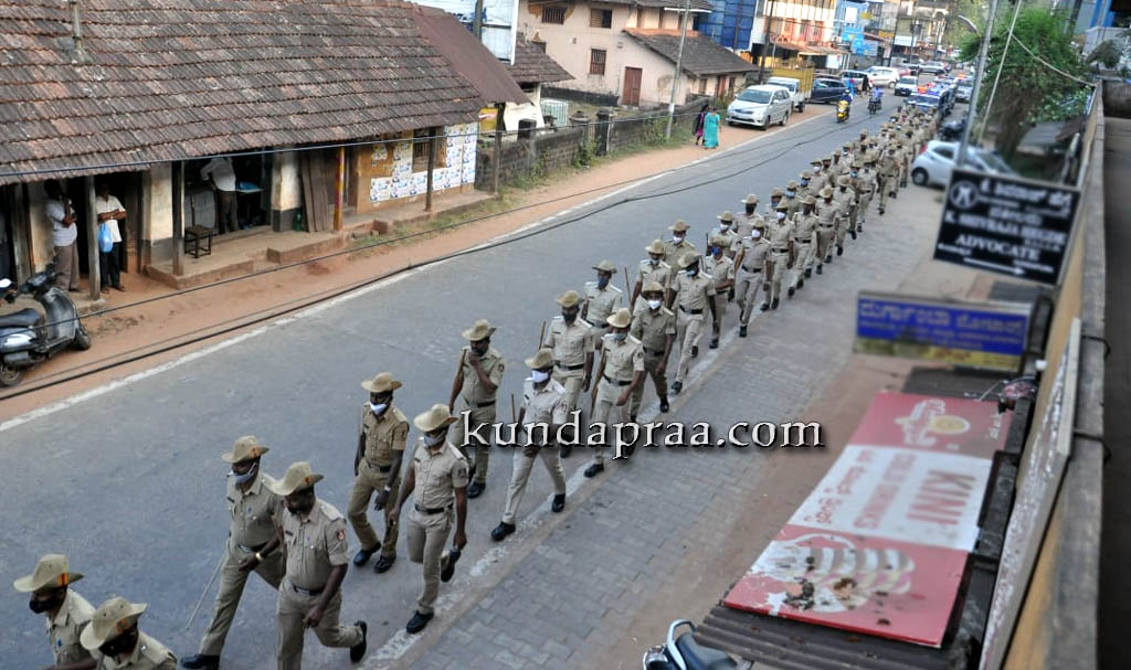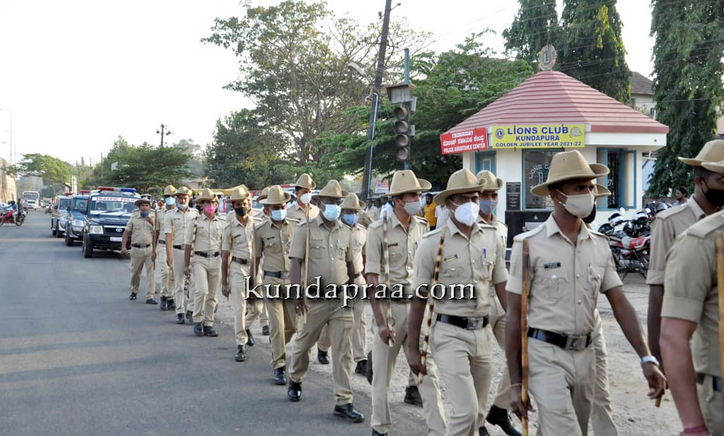 ಕುಂದಾಪುರ,ಫೆ.12: ಉಡುಪಿ ಕೇಂದ್ರೀಕೃತವಾಗಿ ರಾಜ್ಯ ವ್ಯಾಪ್ತಿಯಲ್ಲಿ ಅಶಾಂತಿ ಮೂಡಿಸಲು ಕಾರಣವಾಗಿರುವ ಹಿಜಾಬ್-ಕೇಸರು ಶಾಲು ವಿವಾದ ಹಿನ್ನೆಲೆಯಲ್ಲಿ ಜಿಲ್ಲೆಯಲ್ಲಿ ನಗರದಲ್ಲಿ ಶಾಂತಿ, ಸುವ್ಯವಸ್ಥೆ ಕಾಪಾಡುವುದು ಹಾಗೂ ಸಾರ್ವಜನಿಕರಿಗೆ ಧೈರ್ಯ ತುಂಬುವ ನಿಟ್ಟಿನಲ್ಲಿ ಪೊಲೀಸ್ ಇಲಾಖೆ ರೂಟ್ ಮಾರ್ಚ್ (ಪಥ ಸಂಚಲನ) ನಡೆಸಿದ್ದು, ಕುಂದಾಪುರ ಉಪವಿಭಾಗ ವ್ಯಾಪ್ತಿಯಲ್ಲಿಯೂ ಶುಕ್ರವಾರ ಸಂಜೆ ನಡೆಯಿತು.