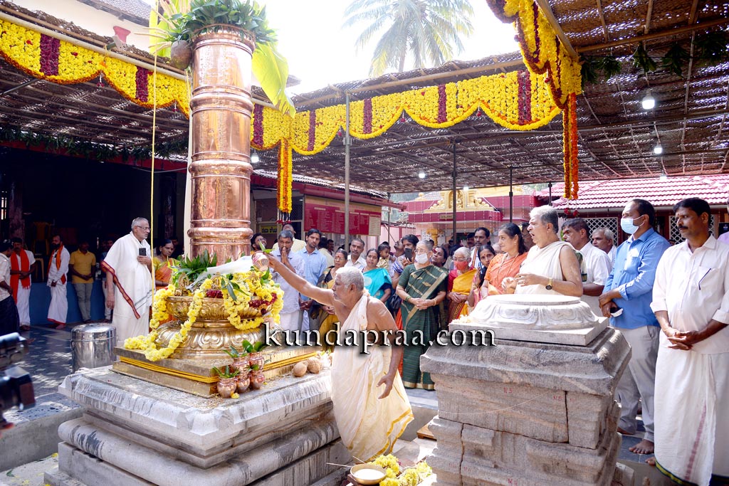 ಕುಂದಾಪುರ: ಸಪ್ತ ಮೋಕ್ಷಪ್ರದ ಕ್ಷೇತ್ರಗಳಲ್ಲಿ ಒಂದಾದ ಕೋಟೇಶ್ವರದ ಮಹಾತೋಬಾರ ಶ್ರೀ ಕೋಟಿಲಿಂಗೇಶ್ವರ ದೇವಾಲಯದಲ್ಲಿ ೬೭ ವರ್ಷಗಳ ನಂತರ ನಡೆಯುತ್ತಿರುವ ಬ್ರಹ್ಮಕಲಶೋತ್ಸವದ ಕಾರ್ಯಕ್ರಮದ ಸಂದರ್ಭ ಸುಮಾರು ೭೩ ಅಡಿ ಎತ್ತರದ ನೂತನ ಧ್ವಜಸ್ಥಂಭ ಪ್ರತಿಷ್ಠಾಪನೆಯನ್ನು ದೇವಳದ ಪ್ರಧಾನ ತಂತ್ರಿ ಪ್ರಸನ್ನ ಕುಮಾರ್ ಐತಾಳ್ ಇವರ ನೇತೃತ್ವದಲ್ಲಿ ಗುರುವಾರ ಕುಂಭ ಲಗ್ನದಲ್ಲಿ ಪ್ರತಿಷ್ಠಾಪಿಸಲಾಯಿತು.