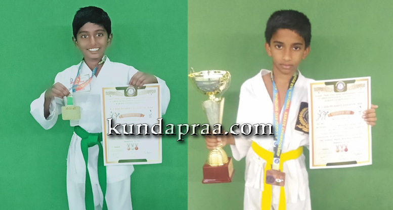 ಕುಂದಾಪುರ: ಎ.ಎಸ್.ಗೋಜು ರಿಯು ಕರಾಟೆ ಅಸೋಸಿಯೇಶನ್ ಇಂಡಿಯಾ ವತಿಯಿಂದ ಫೆ.೨೦ರಂದು ಬೆಂಗಳೂರಿನಲ್ಲಿ ನಡೆದ ಮುಕ್ತ ರಾಷ್ಟ್ರಮಟ್ಟದ ಕರಾಟೆ ಚಾಂಪಿಯನ್ಶಿಪ್ ನಲ್ಲಿ ಗುಡ್ರಿ ಸಂತೋಷ ಮತ್ತು ಹೇಮಾವತಿ ದಂಪತಿಗಳ ಪುತ್ರ ಶ್ರೀಶ ಕಟಾ ವಿಭಾಗದಲ್ಲಿ ದ್ವಿತೀಯ ಸ್ಥಾನ ಗಳಿಸಿ ಬೆಳ್ಳಿಯ ಪದಕ ಪಡೆದಿದ್ದಾರೆ. ಇದೇ ವಿಭಾಗದಲ್ಲಿ ಕೆಂಚನೂರಿನ ಸಂತೋಷ ಮತ್ತು ಸುಜಾತ ದಂಪತಿಗಳ ಪುತ್ರ ಸೃಜನ್ ಎಸ್ ಕಂಚಿನ ಪದಕ ಪಡೆದಿದ್ದಾರೆ.