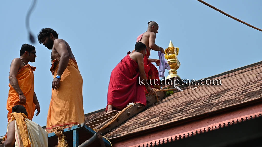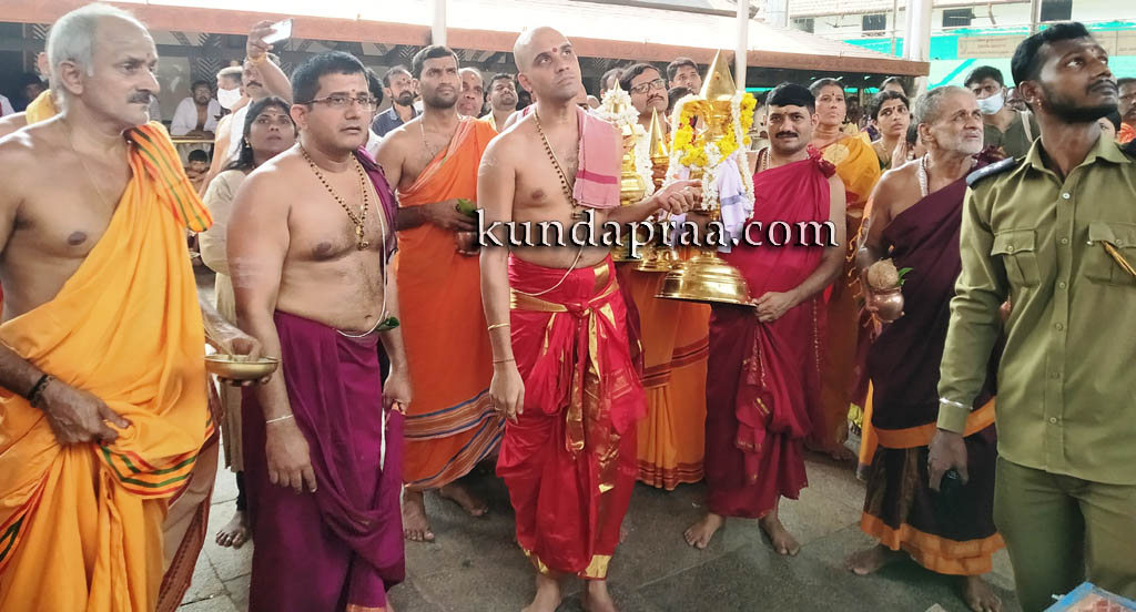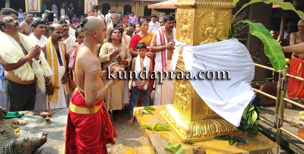 ಕೊಲ್ಲೂರು ಶ್ರೀ ಮೂಕಾಂಬಿಕಾ ಅಮ್ಮನವರ ದೇವಸ್ಥಾನದಲ್ಲಿ ಶುಕ್ರವಾರ ಬೆಳಿಗ್ಗೆ ದೇವಳದ ಪ್ರಧಾನ ಅರ್ಚಕ ಹಾಗೂ ತಂತ್ರಿ ಡಾ. ಕೆ. ರಾಮಚಂದ್ರ ಅಡಿಗ ನೇತೃತ್ವದಲ್ಲಿ ದೇವಳದ ಪಶ್ಚಿಮ ದ್ವಾರ (ಆನೆಬಾಗಿಲು)ಕ್ಕೆ ಚಿನ್ನದ ಲೇಪನದ ಶಿಖರ (ಸ್ವರ್ಣಕಲಶ) ಪ್ರತಿಷ್ಠೆ ಮಾಡಲಾಯಿತು. ದೇವಳದ ಕಾರ್ಯನಿರ್ವಹಣಾಧಿಕಾರಿ ಎಸ್. ಪಿ. ಬಿ. ಮಹೇಶ್, ವ್ಯವಸ್ಥಾಪನಾ ಸಮಿತಿ ಅಧ್ಯಕ್ಷ ಕೆರಾಡಿ ಚಂದ್ರಶೇಖರ ಶೆಟ್ಟಿ, ಸದಸ್ಯರಾದ ಜಯಾನಂದ ಹೋಬಳಿದಾರ್, ಡಾ. ಅತುಲ್ಕುಮಾರ್ ಶೆಟ್ಟಿ, ಗೋಪಾಲಕೃಷ್ಣ ನಾಡ, ಬೆಳ್ವೆ ಗಣೇಶ ಕಿಣಿ, ಕೆ. ಪಿ. ಶೇಖರ್, ಸಂಧ್ಯಾ ರಮೇಶ್, ರತ್ನಾ ರಮೇಶ್ ಕುಂದರ್, ದೇವಳದ ಅರ್ಚಕರಾದ ನಾರ್ಸಿ ಗೋವಿಂದ ಅಡಿಗ ಮೊದಲಾದವರು ಇದ್ದರು.