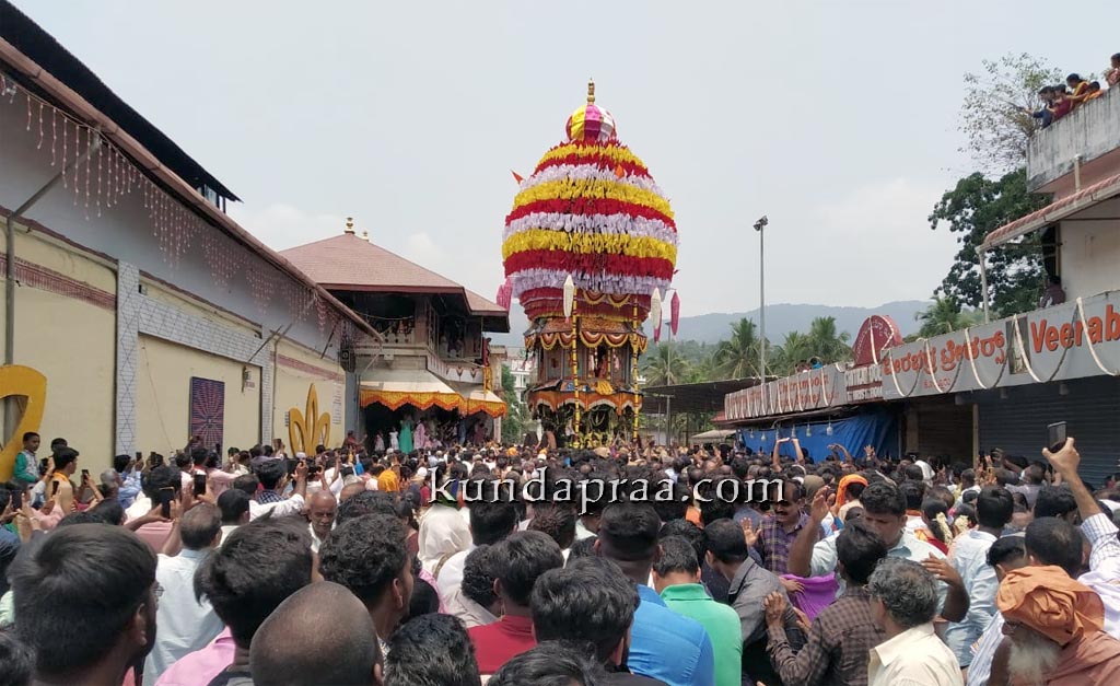 ದೇವಳದಲ್ಲಿ ಮುಹೂರ್ತ ಬಲಿ, ಕ್ಷಿಪ್ರ ಬಲಿ ಹಾಗೂ ರಥ ಬಲಿಯ ಬಳಿಕ ಕೊಲ್ಲೂರಿನ ರಥೋತ್ಸವದ ಪರಂಪರೆಯಂತೆ ಜೋಡಿ (ಎರಡು) ಉತ್ಸವ ಮೂರ್ತಿಗಳನ್ನು ಬ್ರಹ್ಮರಥದಲ್ಲಿ ಕುಳ್ಳಿರಿಸಿ ರಥೋತ್ಸವ ನಡೆಸಲಾಯಿತು. ಬೀದಿ ಗಣಪತಿ ದೇವಸ್ಥಾನದವರೆಗೆ ರಥವನ್ನು ಎಳೆದು ರಥೋತ್ಸವ ನಡೆಸಲಾಯಿತು. ತೇರಿನ ಈ ವೈಭವವನ್ನು ಸಾವಿರಾರು ಭಕ್ತರು ಕಣ್ತುಂಬಿಕೊಂಡರು. ಸಂಜೆಯ ಬಳಿಕ ಬ್ರಹ್ಮರಥವನ್ನು ಶಂಕರಾಶ್ರಮದವರೆಗೆ ಕೊಂಡೊಯ್ಯಲಾಗುತ್ತದೆ.