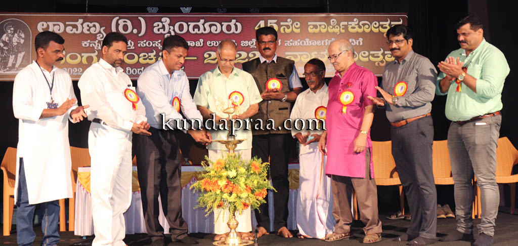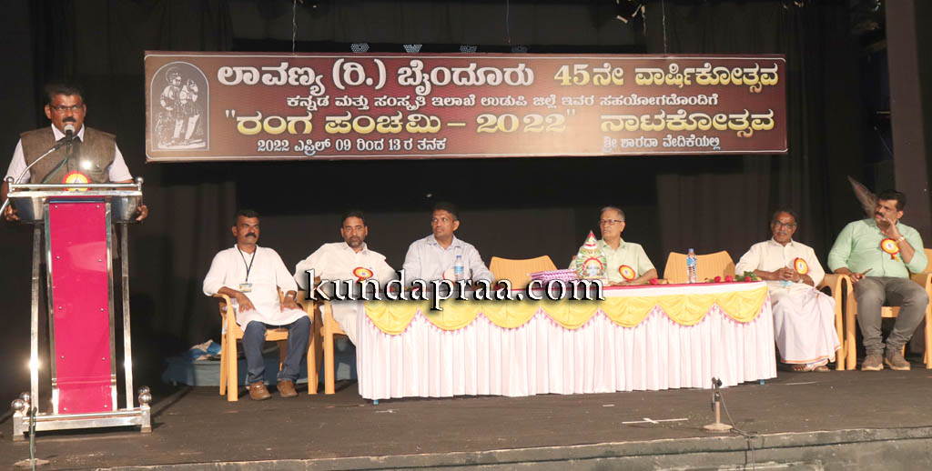 ಅವರು ಶನಿವಾರ ಇಲ್ಲಿನ ಶಾರದಾ ವೇದಿಕೆಯಲ್ಲಿ ಲಾವಣ್ಯ ರಿ. ಬೈಂದೂರು 45ನೇ ವಾರ್ಷಿಕೋತ್ಸವ ಹಾಗೂ ಕನ್ನಡ ಮತ್ತು ಸಂಸ್ಕೃತಿ ಇಲಾಖೆ ಸಹಯೋಗದೊಂದಿಗೆ ಆಯೋಜಿಸಲಾದ ರಂಗಪಂಚಮಿ -2022 ನಾಟಕೋತ್ಸವವನ್ನು ಉದ್ಫಾಟಿಸಿ ಮಾತನಾಡಿ ನಾಲ್ಕು ದಶಕಗಳನ್ನು ಕಂಡ ಲಾವಣ್ಯ, ತಲೆಮಾರುಗಳ ಅನುಭವವನ್ನು ಕಟ್ಟಿಕೊಂಡು ಗಟ್ಟಿಯಾಗಿ ಮುನ್ನಡೆಯುತ್ತಿರುವುದು ಹೆಮ್ಮೆಯ ಸಂಗತಿಯಾಗಿದೆ ಎಂದರು.