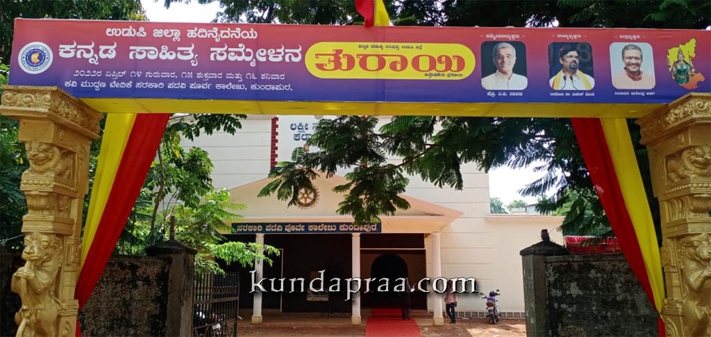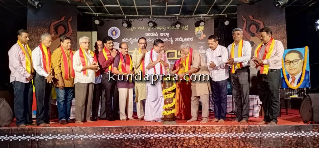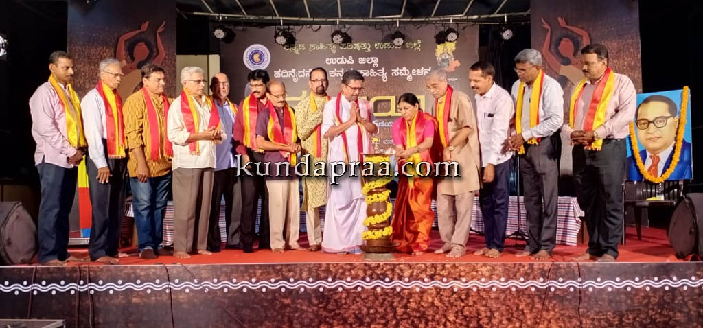 ಉಡುಪಿ ಜಿಲ್ಲಾ ಕನ್ನಡ ಸಾಹಿತ್ಯ ಪರಿಷತ್ ಆಶ್ರಯದಲ್ಲಿ ಕುಂದಾಪುರದ ಪದವಿಪೂರ್ವ ಕಾಲೇಜು ಕವಿ ಮುದ್ದಣ ವೇದಿಕೆಯಲ್ಲಿ ಗುರುವಾರ ಹದಿನೈದನೇ ಜಿಲ್ಲಾ ಕನ್ನಡ ಸಾಹಿತ್ಯ ಸಮ್ಮೇಳನ ’ತುರಾಯಿ’ ಅನ್ವೇಷಣೆಯ ಪ್ರತಿಬಿಂಬ ಇದರ ಸಾಂಸ್ಕೃತಿಕ ಕಾರ್ಯಕ್ರಮ ಮೂಲಕ ಚಾಲನೆ ನೀಡಿ, ಅಂಬೇಡ್ಕರ್ ಜಯಂತಿ ಹಿನ್ನೆಲೆಯಲ್ಲಿ ಡಾ. ಬಾಬಾ ಸಾಹೇಬ್ ಅಂಬೇಡ್ಕರ್ ಭಾವಚಿತ್ರಕ್ಕೆ ಪುಷ್ಪನಮನ ಸಲ್ಲಿಸಲಾಯಿತು.