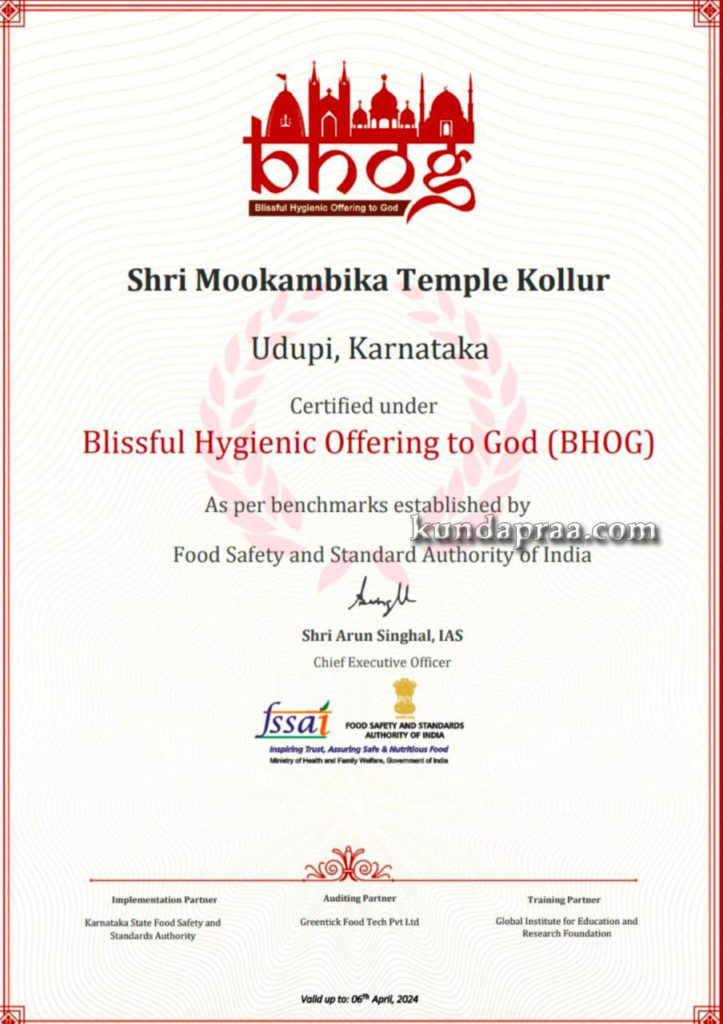ಈ ಎಲ್ಲಾ ಮುನ್ನೆಚ್ಚರಿಕಾ ಕ್ರಮಗಳನ್ನು ಕೈಗೊಂಡು, ಕೊಲ್ಲೂರು ಶ್ರೀ ಮೂಕಾಂಬಿಕ ದೇವಾಲಯಕ್ಕೆ ಆಗಮಿಸುವ ಭಕ್ತಾದಿಗಳಿಗೆ ಅತ್ಯಂತ ಪರಿಶುದ್ದ, ಸುರಕ್ಷಿತ ಮತ್ತು ಗುಣಮಟ್ಟದ ಭೋಜನ ಪ್ರಸಾದವÀನ್ನು ನೀಡಲಾಗುತ್ತಿದ್ದು, ಭಾರತ ಸರ್ಕಾರದ ಆಹಾರ ಸುರಕ್ಷತೆ ಮತ್ತು ಗುಣಮಟ್ಟ ಪ್ರಾಧಿಕಾರದ ಮುಖ್ಯ ಕಾರ್ಯನಿರ್ವಾಹಕ ಅಧಿಕಾರಿಗಳು ಈ ಪ್ರಮಾಣಪತ್ರವನ್ನು ನೀಡಿದ್ದಾರೆ.
